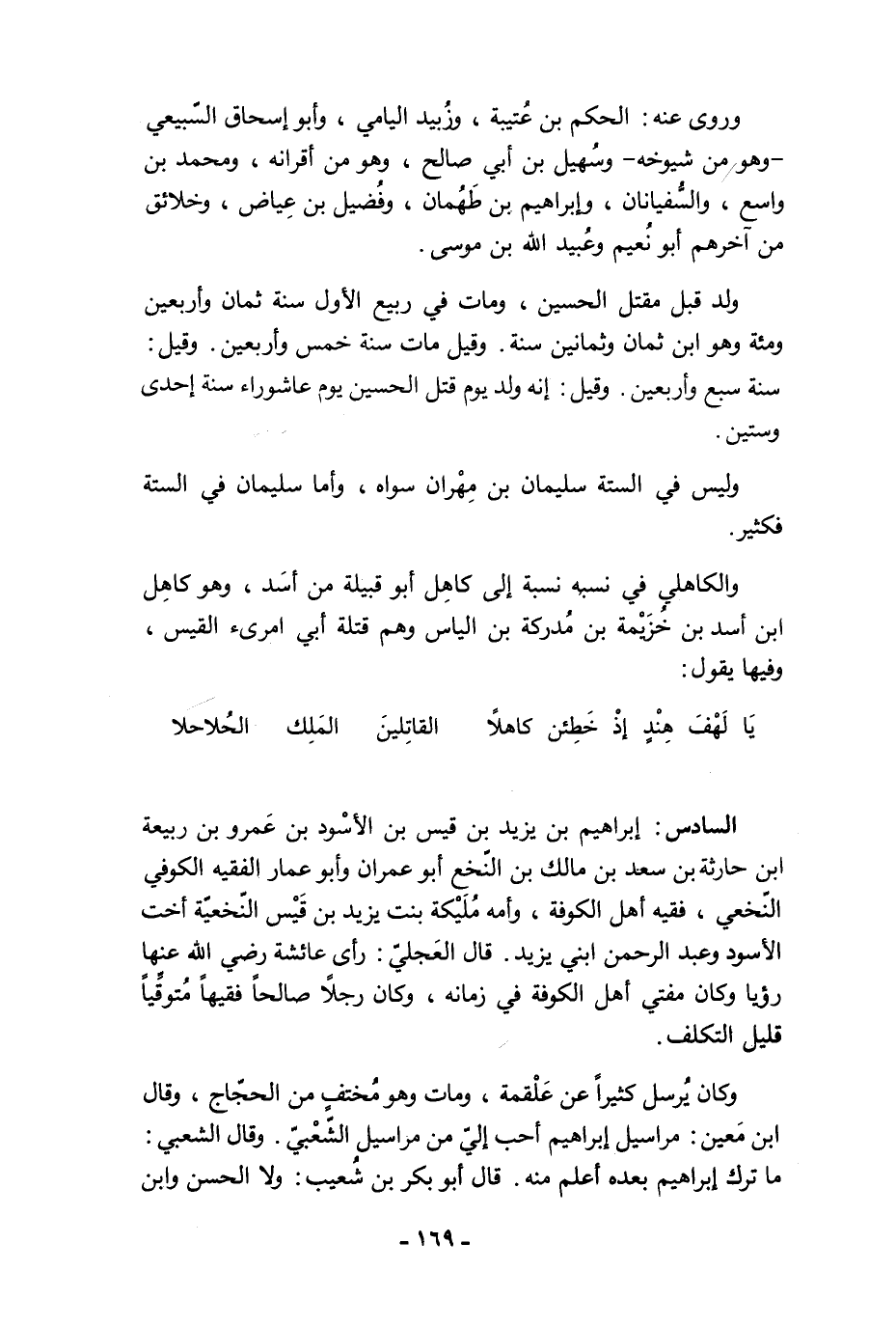 السادس: إبراهيم بن يزيد بن قيس بن الأسْود بن عَمرو بن ربيعة ابن حارثة بن سعد بن مالك بن النّخع أبو عمران وأبو عمار الفقيه الكوفي النّخعي، فقيه أهل الكوفة، وأمه مُلَيْكة بنت يزيد بن قَيْس النّخعيّة أخت الأسود وعبد الرحمن ابني يزيد. قال العَجليّ: رأى عائشة - رضي الله عنها - رؤيا وكان مفتي أهل الكوفة في زمانه، وكان رجلًا صالحًا فقيهًا مُتوقِّيًا قليل التكلف.