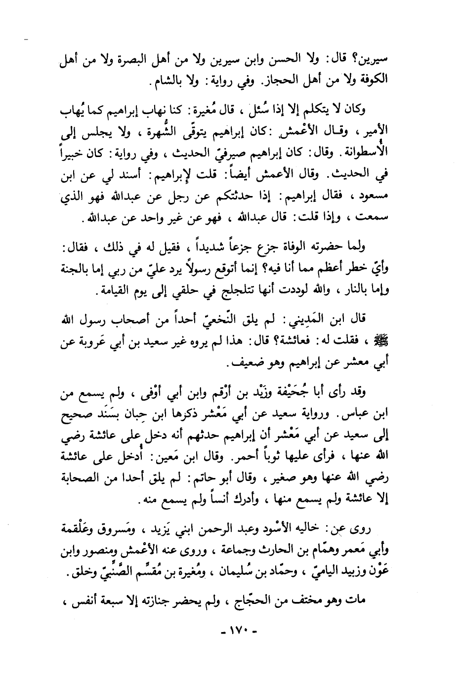 قال ابن المَدِيني: لم يلق النّخعيّ أحدًا من أصحاب رسول الله - صلى الله عليه وسلم -، فقلت له: فعائشة؟ قال: هذا لم يروه غير سعيد بن أبي عَروبة عن أبي معشر عن إبراهيم وهو ضعيف.