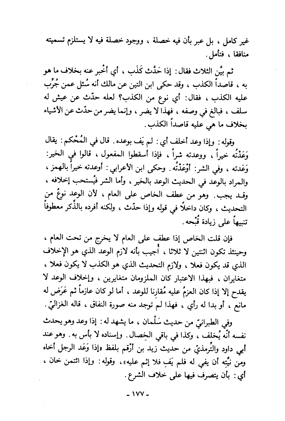 فإن قلت الخاص إذا عطف على العام لا يخرج من تحت العام، وحينئذ تكون اثنتين لا ثلاثًا، أُجيب بأنه لازم الوعد الذي هو الإِخلاف الذي قد يكون فعلا، ولازم التحديث الذي هو الكذب لا يكون فعلا، متغايران، فبهذا الاعتبار كان الملزومان متغايرين، وإخلاف الوعد لا يقدح إلا إذا كان العزمُ عليه مُقارِنا للوعد، أما لو كان عازمًا ثم عَرَض له مانع، أو بدا له رأي، فهذا لم توجد منه صورة النفاق، قاله الغزاليّ.