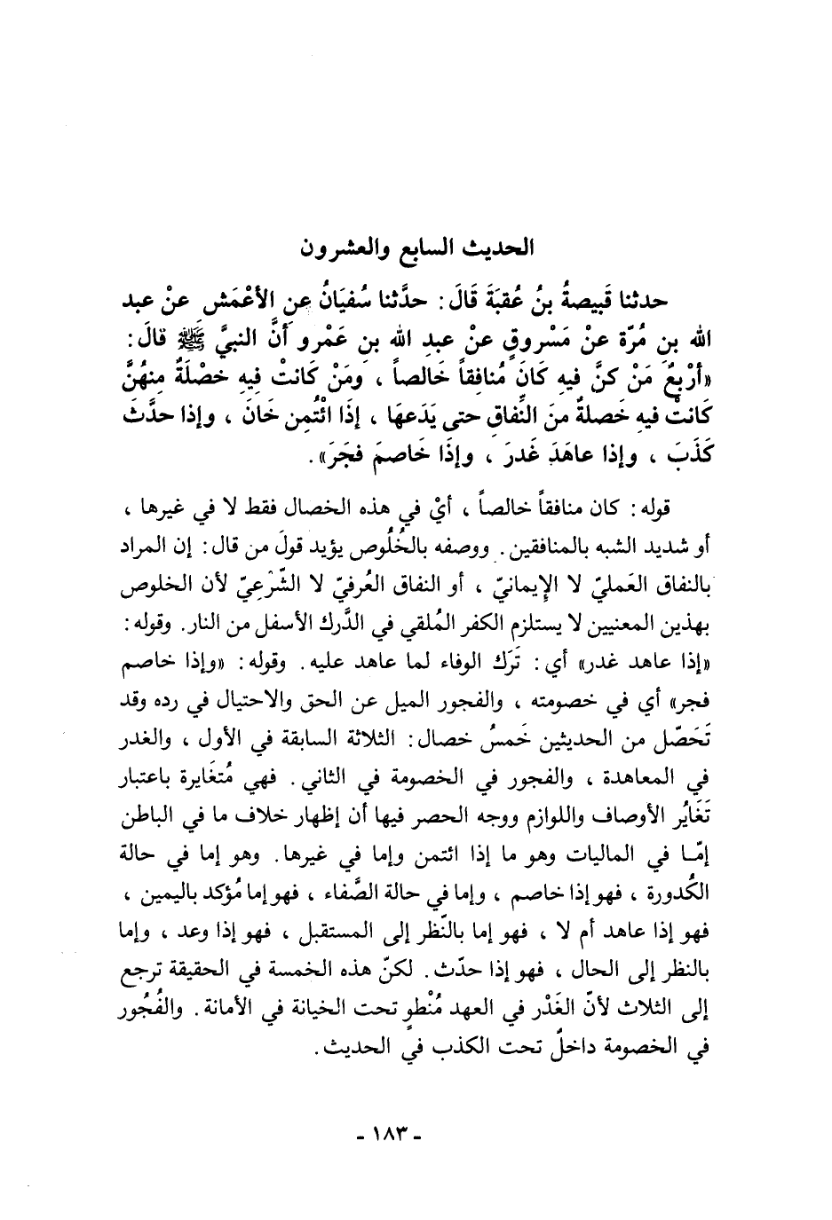 34 - حَدَّثَنَا قَبِيصَةُ بْنُ عُقْبَةَ قَالَ: حَدَّثَنَا سُفْيَانُ عَنِ الأَعْمَشِ عَنْ عَبْدِ اللَّهِ بْنِ مُرَّةَ عَنْ مَسْرُوقٍ عَنْ عَبْدِ اللَّهِ بْنِ عَمْرٍو أَنَّ النَّبِيَّ - صلى الله عليه وسلم - قَالَ: «أَرْبَعٌ مَنْ كُنَّ فِيهِ كَانَ مُنَافِقًا خَالِصًا، وَمَنْ كَانَتْ فِيهِ خَصْلَةٌ مِنْهُنَّ كَانَتْ فِيهِ خَصْلَةٌ مِنَ النِّفَاقِ حَتَّى يَدَعَهَا، إِذَا اؤْتُمِنَ خَانَ، وَإِذَا حَدَّثَ كَذَبَ، وَإِذَا عَاهَدَ غَدَرَ، وَإِذَا خَاصَمَ فَجَرَ».