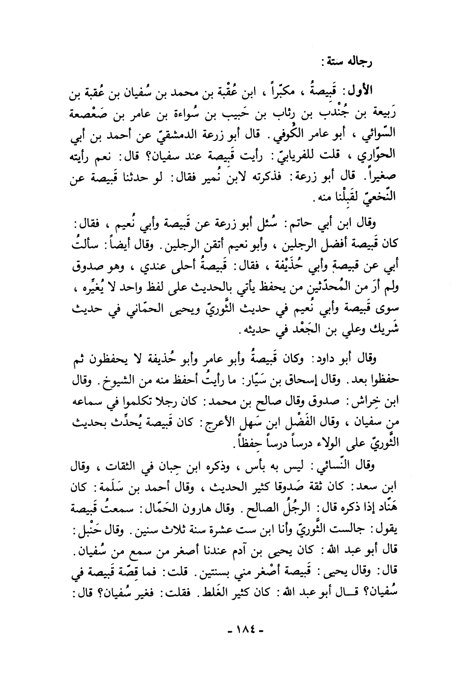قال: وقال يحيى: قَبيصة أصْغر مني بسنتين. قلت: فما قِصّة قَبيصة في سُفيان؟ قال أبو عبد الله: كان كثير الغَلط. فقلت: فغير سُفيان؟ قال: