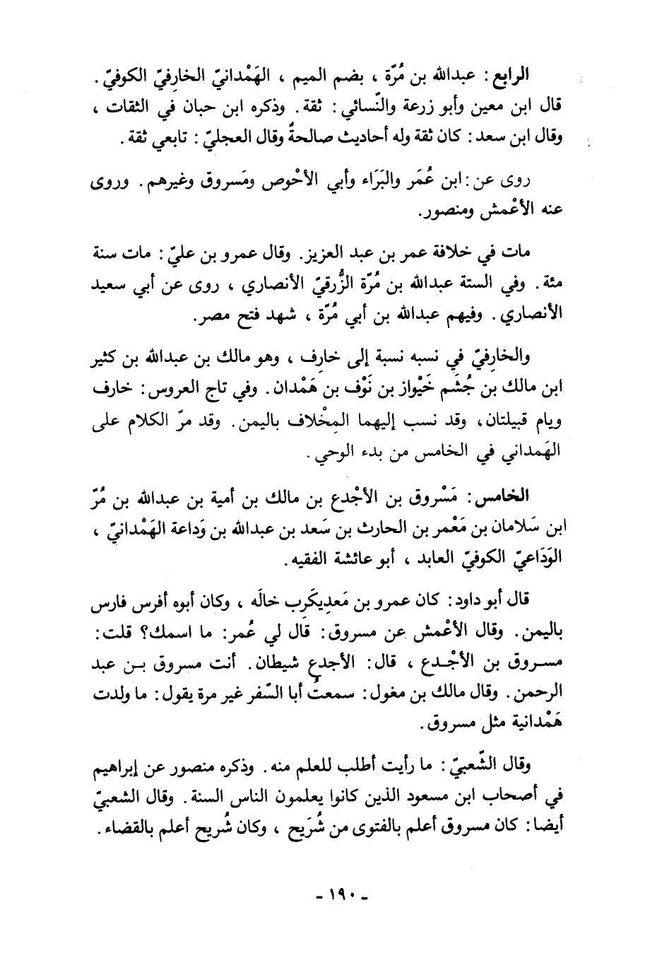 الخامس: مَسْروق بن الأجْدع بن مالك بن أمية بن عبد الله بن مُرّ ابن سَلامان بن مَعْمر بن الحارث بن سَعد بن عبد الله بن وَداعة الهَمْدانيّ، الوَدَاعيّ الكوفيّ العابد، أبو عائشة الفقيه.