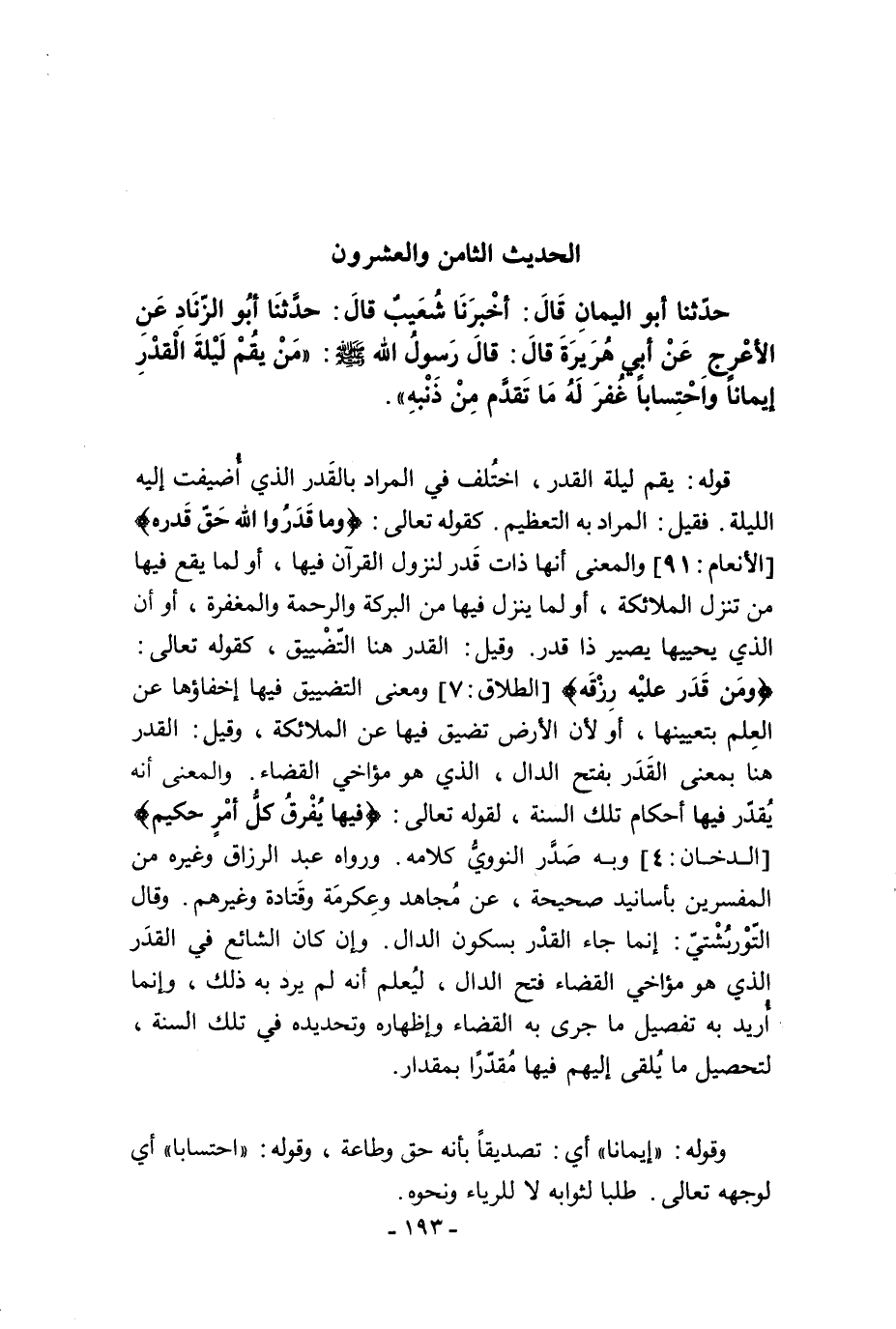 35 - حَدَّثَنَا أَبُو الْيَمَانِ قَالَ: أَخْبَرَنَا شُعَيْبٌ قَالَ: حَدَّثَنَا أَبُو الزِّنَادِ عَنِ الأَعْرَجِ عَنْ أَبِي هُرَيْرَةَ قَالَ: قَالَ رَسُولُ اللَّهِ - صلى الله عليه وسلم -: «مَنْ يَقُمْ لَيْلَةَ الْقَدْرِ إِيمَانًا وَاحْتِسَابًا غُفِرَ لَهُ مَا تَقَدَّمَ مِنْ ذَنْبِهِ».