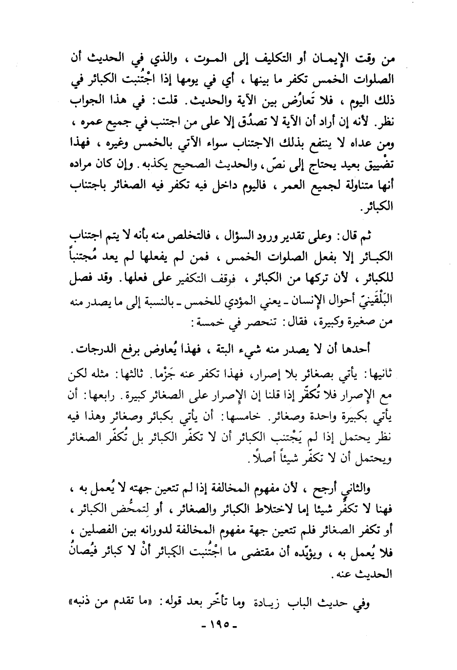 ثم قال: وعلى تقدير ورود السؤال، فالتخلص منه بأنه لا يتم اجتناب الكبائر إلا بفعل الصلوات الخمس، فمن لم يفعلها لم يعد مُجتنبًا للكبائر، لأن تركها من الكبائر، فوقف التكفير على فعلها. وقد فصل البَلْقَينيّ أحوال الإِنسان -يعني المؤدي للخمس- بالنسبة إلى ما يصدر منه من صغيرة وكبيرة، فقال: تنحصر في خمسة: