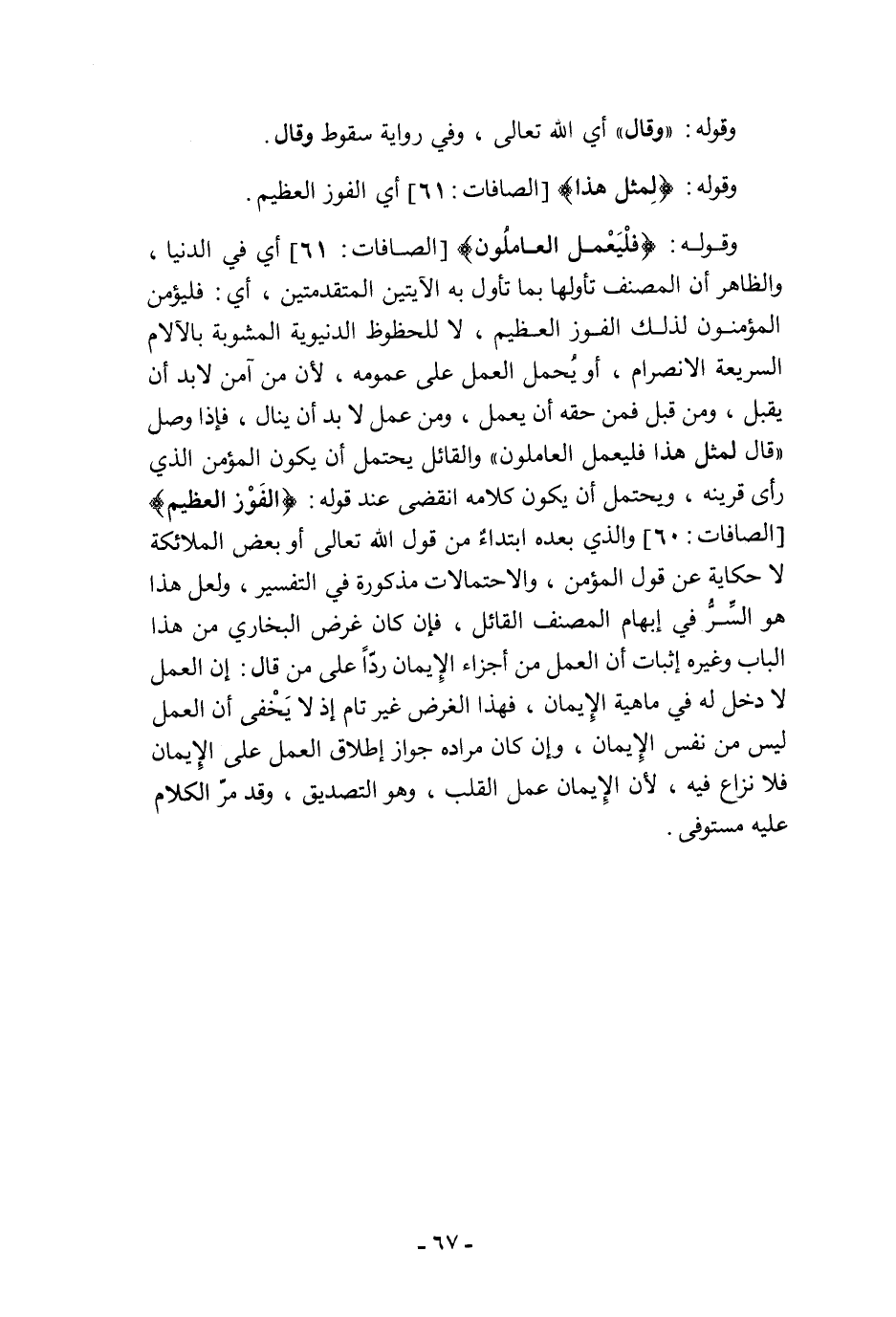 وقوله: {فَلْيَعْمَلِ الْعَامِلُونَ} [الصافات: 61] أي في الدنيا، والظاهر أن المصنف تأولها بما تأول به الآيتين المتقدمتين، أي: فليؤمن المؤمنون لذلك الفوز العظيم، لا للحظوظ الدنيوية المشوبة بالآلام السريعة الانصرام، أو يُحمل العمل على عمومه، لأن من آمن لا بد أن يقبل، ومن قبل فمن حقه أن يعمل، ومن عمل لا بد أن ينال، فإذا وصل "قال لمثل هذا فليعمل العاملون" والقائل يحتمل أن يكون المؤمن الذي رأى قرينه، ويحتمل أن يكون كلامه انقضى عند قوله: {الْفَوْزُ الْعَظِيمُ} [الصافات: 60] والذي بعده ابتداءٌ من قول الله تعالى أو بعض الملائكة لا حكاية عن قول المؤمن، والاحتمالات مذكورة في التفسير، ولعل هذا هو السِّرُّ في إبهام المصنف القائل، فإن كان غرض البخاري من هذا الباب وغيره إثبات أن العمل من أجزاء الإِيمان ردًّا على من قال: إن العمل لا دخل له في ماهية الإِيمان، فهذا الغرض غير تام إذ لا يَخْفى أن العمل ليس من نفس الإِيمان، وإن كان مراده جواز إطلاق العمل على الإِيمان فلا نزاع فيه، لأن الإِيمان عمل القلب، وهو التصديق، وقد مرّ الكلام عليه مستوفى.