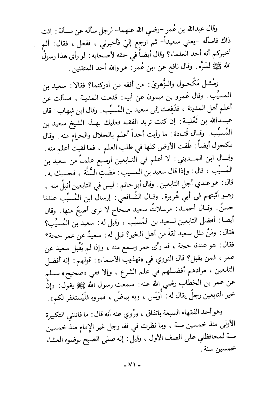 وقال عبد الله بن عُمر - رضي الله عنهما - لرجل سأله عن مسألة: ائت ذاك فاسأله -يعني سعيدًا- ثم ارجع إليّ فأخبرني، ففعل، فقال: ألم أخبركم أنه أحد العلماء؟ وقال أيضًا في حقه لأصحابه: لو رأى هذا رسولُ الله - صلى الله عليه وسلم - لسَرَّه. وقال نافع عن ابن عُمر: هو والله أحد المتقنين.