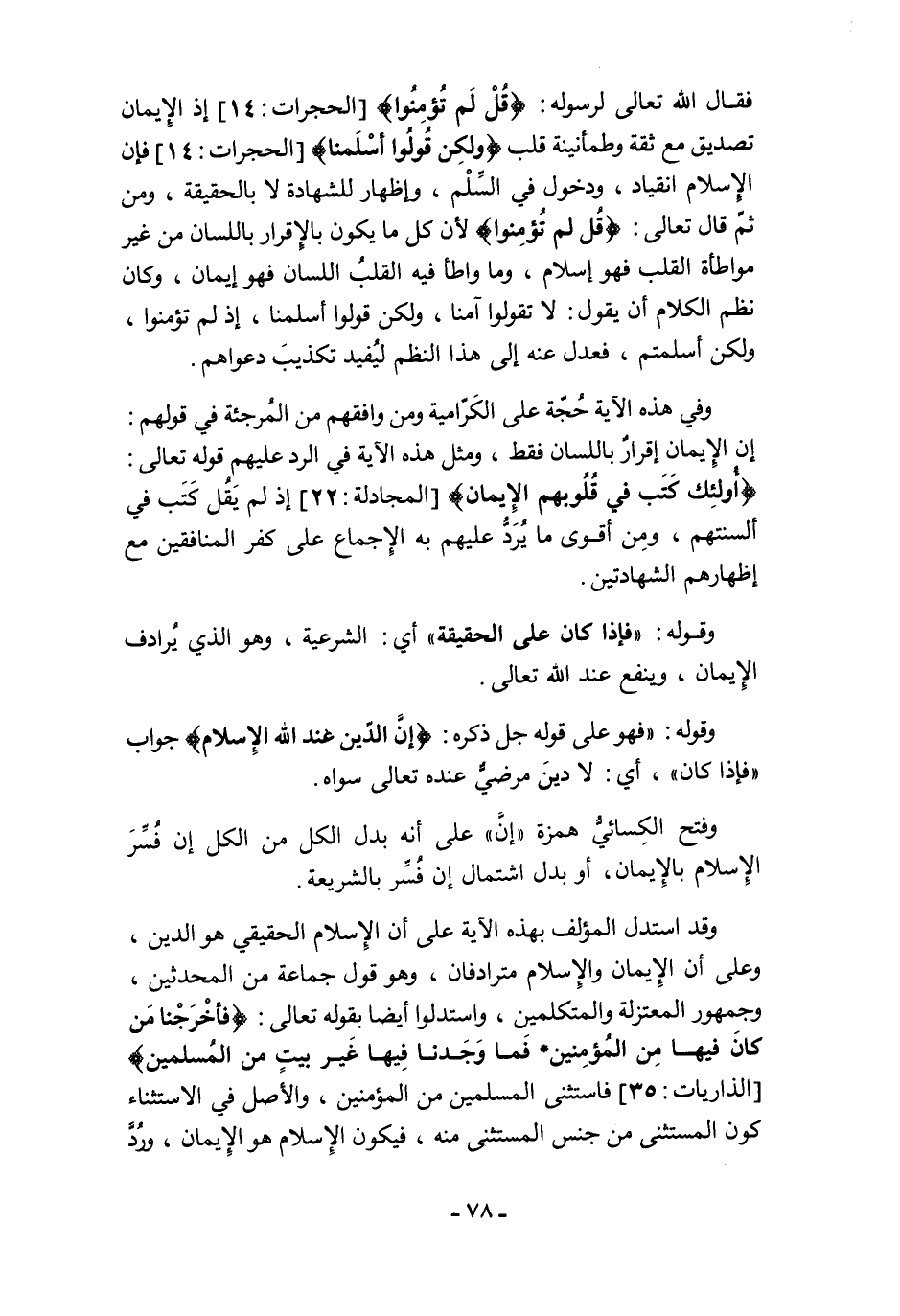 وقد استدل المؤلف بهذه الآية على أن الإِسلام الحقيقي هو الدين، وعلى أن الإِيمان والإِسلام مترادفان، وهو قول جماعة من المحدثين، وجمهور المعتزلة والمتكلمين، واستدلوا أيضًا بقوله تعالى: {فَأَخْرَجْنَا مَنْ كَانَ فِيهَا مِنَ الْمُؤْمِنِينَ (35) فَمَا وَجَدْنَا فِيهَا غَيْرَ بَيْتٍ مِنَ الْمُسْلِمِينَ} [الذاريات: 35] فاستثنى المسلمين من المؤمنين، والأصل في الاستثناء كون المستثنى من جنس المستثنى منه، فيكون الإِسلام هو الإِيمان، ورُدَّ