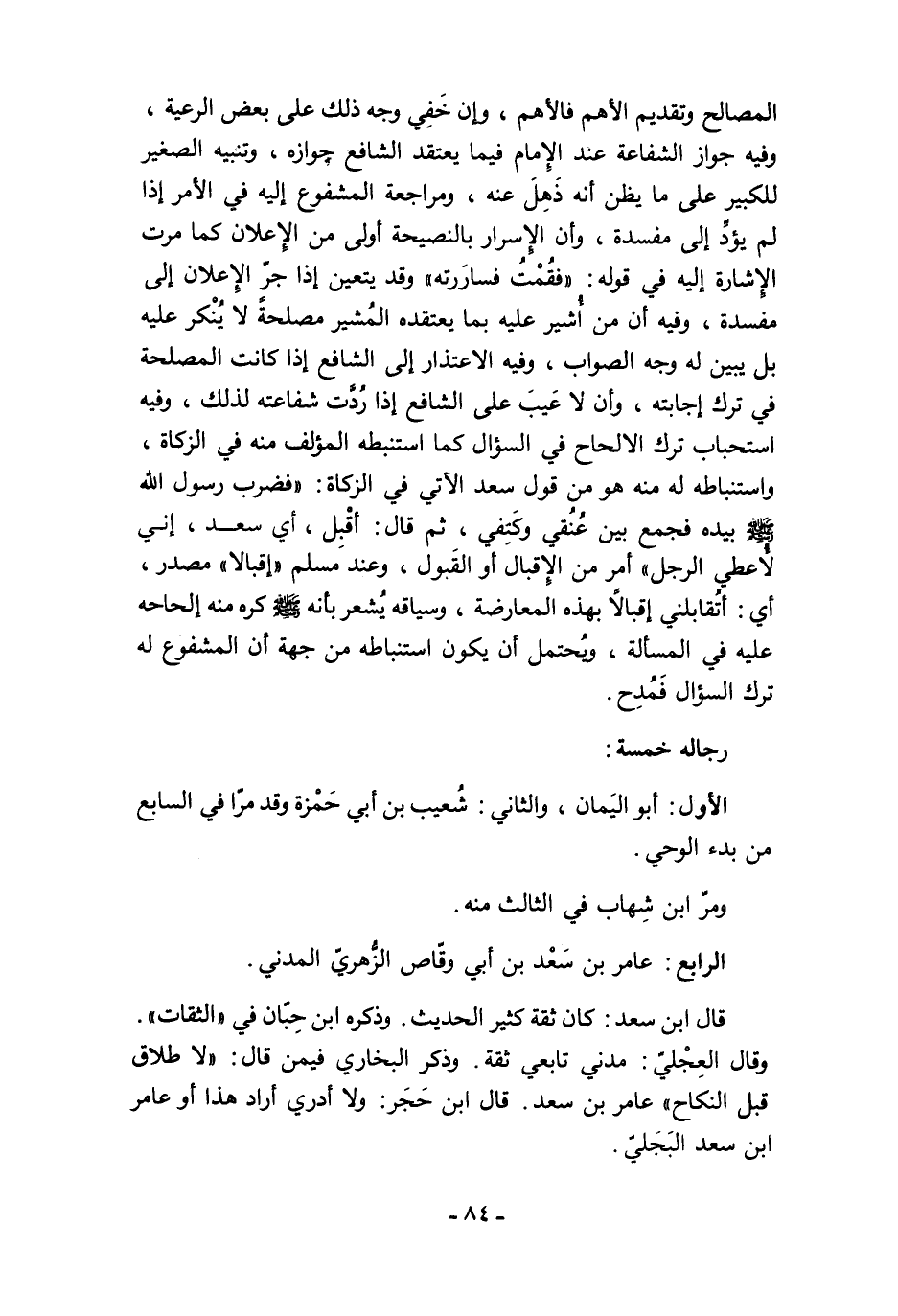 المصالح وتقديم الأهم فالأهم، وإن خَفِي وجه ذلك على بعض الرعية، وفيه جواز الشفاعة عند الإِمام فيما يعتقد الشافع جوازه، وتنبيه الصغير للكبير على ما يظن أنه ذَهِلَ عنه، ومراجعة المشفوع إليه في الأمر إذا لم يؤدِّ إلى مفسدة، وأن الإِسرار بالنصيحة أولى من الإِعلان كما مرت الإِشارة إليه في قوله: "فقُمْتُ فسارَرته" وقد يتعين إذا جرّ الإِعلان إلى مفسدة، وفيه أن من أُشير عليه بما يعتقده المُشير مصلحةً لا يُنْكر عليه بل يبين له وجه الصواب، وفيه الاعتذار إلى الشافع إذا كانت المصلحة في ترك إجابته، وأن لا عَيبَ على الشافع إذا رُدَّت شفاعته لذلك، وفيه استحباب ترك الالحاح في السؤال كما استنبطه المؤلف منه في الزكاة، واستنباطه له منه هو من قول سعد الآتي في الزكاة: "فضرب رسول الله - صلى الله عليه وسلم - بيده فجمع بين عُنُقي وكَتِفي، ثم قال: أقْبِل، أي سعد، إني لأُعطي الرجل" أمر من الإِقبال أو القَبول، وعند مسلم "إقبالا" مصدر، أي: أتُقابلني إقبالًا بهذه المعارضة، وسياقه يُشعر بأنه - صلى الله عليه وسلم - كره منه إلحاحه عليه في المسألة، ويُحتمل أن يكون استنباطه من جهة أن المشفوع له ترك السؤال فَمُدِح.
