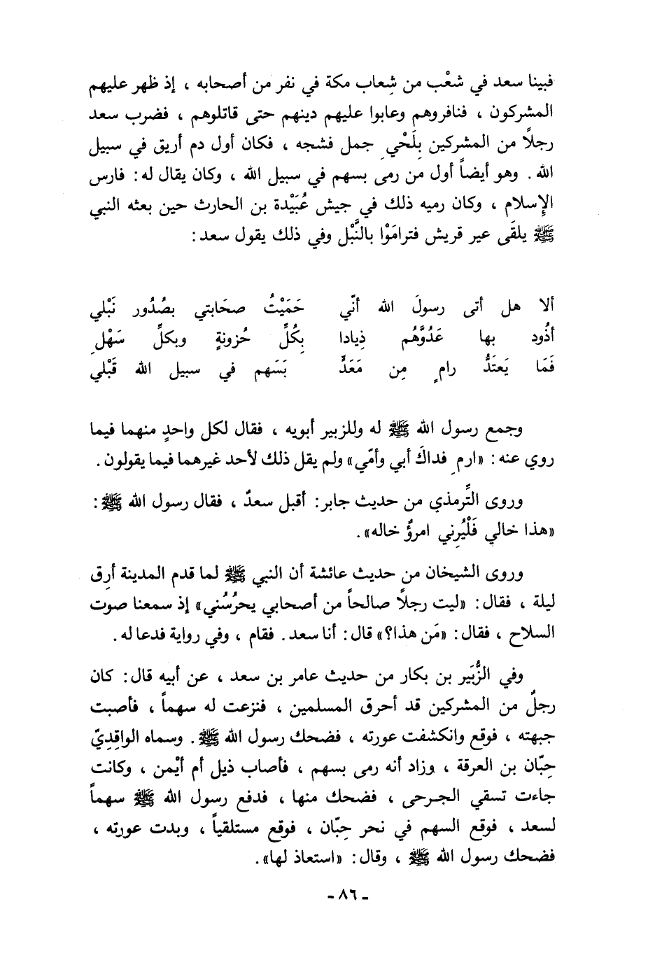 وجمع رسول الله - صلى الله عليه وسلم - له وللزبير أبويه، فقال لكل واحدٍ منهما فيما روي عنه: "ارمِ فداكَ أبي وأمّي" ولم يقل ذلك لأحد غيرهما فيما يقولون.