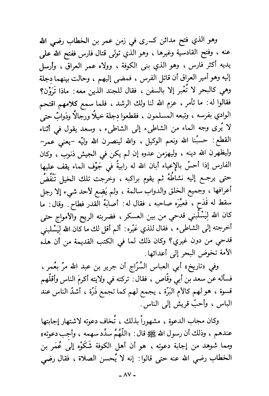 وهو الذي فتح مدائن كسرى في زمن عمر بن الخطاب رضي الله عنه، وفتح القادسية وغيرها، وهو الذي تولى قتال فارس ففتح الله على يديه أكثر فارس، وهو الذي بني الكوفة، وولاه عمر العراق، وأرسل إليه وهو أمير العراق أن قاتل الفرس، فمضى إليهم، وحالت بينهما دِجلة وهي كالبحر لا تُعْبر إلا بالسفن، فقال للجند الذين معه: ماذا تَرَوْن؟ فقالوا له: ما تأمر، عزم الله لنا ولك الرشد، فلما سمع كلامهم اقتحم الوادي بفرسه، وتبعه المسلمون، فقطعوا دِجلة خيلًا ورجالًا ودَوابٌ حتى لا يُرى وجه الماء من الشاطىء إلى الشاطىء، وسعد يقول في أثناء القطع: حسبُنا الله ونعم الوكيل، والله لينصرن الله وليّه -يعني عمر- وليظهرن الله دينه، وليهزمن عدوه إن لم يكن في الجيش ذنوب، وكان الفارس إذا أحسّ بالإِعياء أبان الله له رابيةً في جَوْف الماء يقف عليها حتى يرجع إليه نشاطُهُ ثم يقوم براكبه، وخرجت تلك الخيل تَنْفُضُ أعرافها، وجميع الخلق والدواب سالمة، ولم يَضِع لأحد شيء إلا رجل سقط له قَدَح، فعيَّرَه صاحبه، فقال له: أصابَهُ القدر فطاح. وقال: ما كان الله لِيَسْلُبني قدحي من بين العسكر، فضربته الريح والأمواج حتى أخرجته إلى الشاطىء، فقال للذي عَيّره: ألم أقل لك ما كان الله لِيَسْلبني قدحي من دون غيري؟ وكان ذلك لما في الكتب القديمة من أن هذه الأمة تخوض البحر إلى أعدائها.