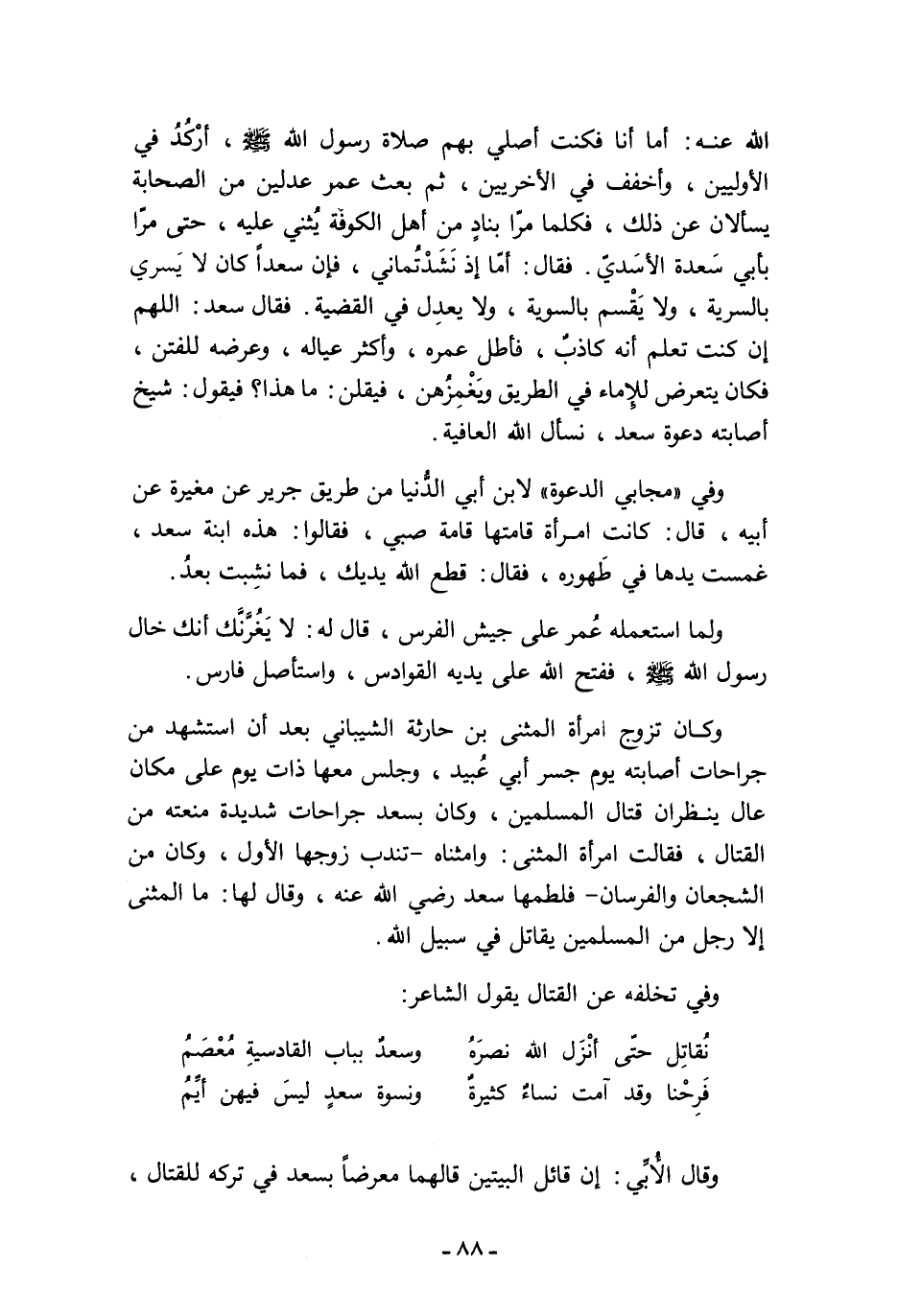 الله عنه -: أما أنا فكنت أصلي بهم صلاة رسول الله - صلى الله عليه وسلم -، أرْكُدُ في الأوليين، وأخفف في الأخريين، ثم بعث عمر عدلين من الصحابة يسألان عن ذلك، فكلما مرّا بنادٍ من أهل الكوفة يُثني عليه، حتى مرّا بأبي سَعدة الأسَديّ. فقال: أمّا إذ نَشَدْتُماني، فإن سعدًا كان لا يَسري بالسرية، ولا يَقْسم بالسوية، ولا يعدِل في القضية. فقال سعد: اللهم إن كنت تعلم أنه كاذبٌ، فأطل عمره، وأكثر عياله، وعرضه للفتن، فكان يتعرض للإِماء في الطريق ويَغْمِزُهن، فيقلن: ما هذا؟ فيقول: شيخ أصابته دعوة سعد، نسأل الله العافية.