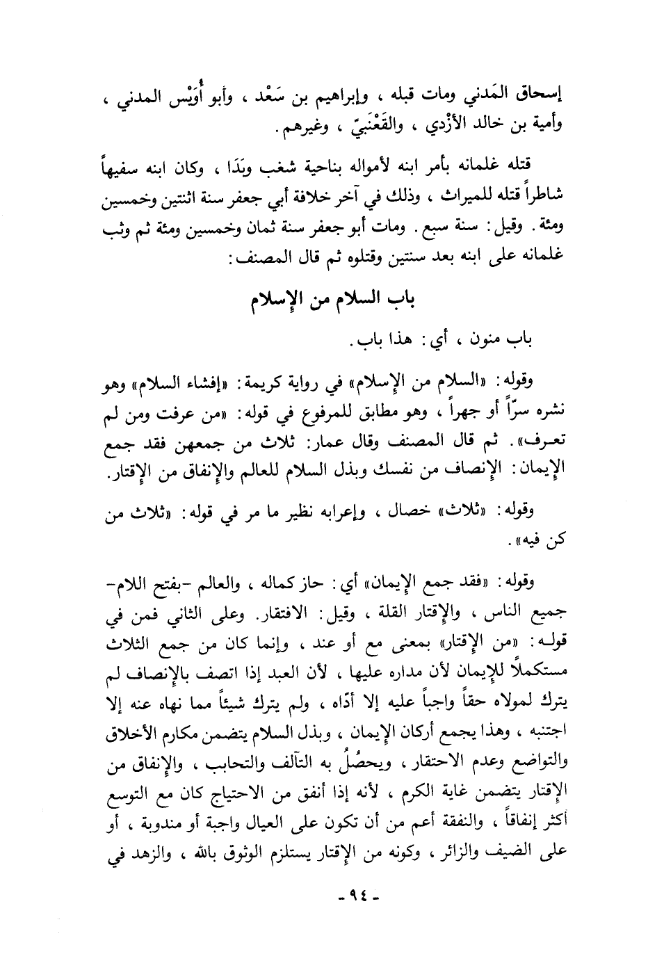 وقوله: "السلام من الإِسلام" في رواية كريمة: "إفشاء السلام" وهو نشره سرًّا أو جهرًا، وهو مطابق للمرفوع في قوله: "من عرفت ومن لم تعرف". ثم قال المصنف وقال عمار: ثلاث من جمعهن فقد جمع الإِيمان: الإِنصاف من نفسك وبذل السلام للعالم والإِنفاق من الإِقتار.
