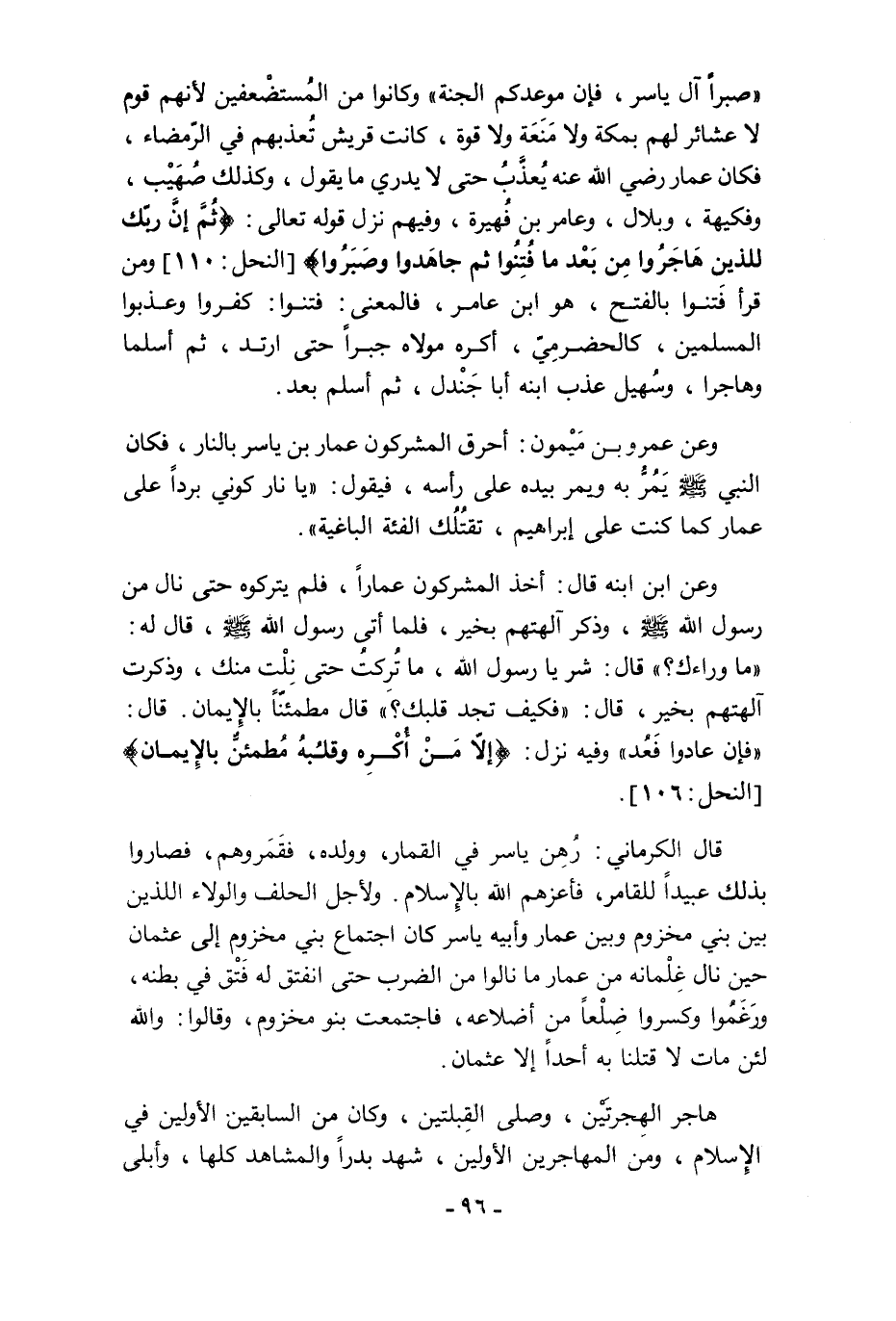 "صبرًا آل ياسر، فإن موعدكم الجنة" وكانوا من المُستضْعفين لأنهم قوم لا عشائر لهم بمكة ولا مَنَعَة ولا قوة، كانت قريش تُعذبهم في الرّمضاء، فكان عمار رضي الله عنه يُعذَّبُ حتى لا يدري ما يقول، وكذلك صُهَيْب، وفكيهة، وبلال، وعامر بن فُهيرة، وفيهم نزل قوله تعالى: {ثُمَّ إِنَّ رَبَّكَ لِلَّذِينَ هَاجَرُوا مِنْ بَعْدِ مَا فُتِنُوا ثُمَّ جَاهَدُوا وَصَبَرُوا} [النحل: 110] ومن قرأ فَتنوا بالفتح، هو ابن عامر، فالمعنى: فتنوا: كفروا وعذبوا المسلمين، كالحضرمِيّ، أكره مولاه جبرًا حتى ارتد، ثم أسلما وهاجرا، وسُهيل عذب ابنه أبا جَنْدل، ثم أسلم بعد.