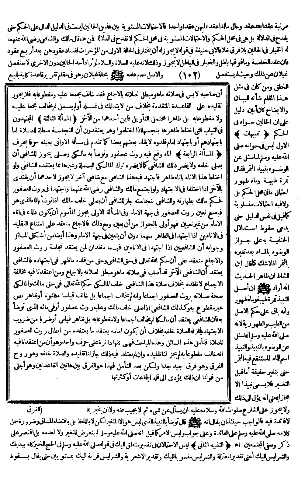 وَهَذَا أَيْضًا مِنْ أَشْكَلِ الْمَسَائِلِ وَجَوَابُهُ أَنَّ لِلشَّافِعِيَّيْنِ إذَا اجْتَهَدَا فِي الْإِنَاءَيْنِ فَهُمَا مُقَلِّدَانِ لِمَنْ يَعْتَقِدُ نَجَاسَةَ رَوْثِ الْعُصْفُورِ وَالْإِجْمَاعُ مُنْعَقِدٌ عَلَى أَنَّ حُكْمَ اللَّهِ تَعَالَى فِي حَقِّ الشَّافِعِيِّ وَحَقِّ مَنْ قَلَّدَهُ مَا ظَهَرَ فِي اجْتِهَادِهِ فَالشَّافِعِيُّ يَعْتَقِدُ أَنَّ الشَّافِعِيَّ الْآخَرَ قَدْ أَصَابَ فِي صَلَاتِهِ مَا هُوَ مُبْطِلٌ لِصَلَاتِهِ بِالْإِجْمَاعِ وَمَنْ اعْتَقَدْنَا فِيهِ مُخَالَفَةَ الْإِجْمَاعِ لَا نُقَلِّدُهُ بِخِلَافِ صَلَاةِ هَذَا الشَّافِعِيِّ خَلْفَ الْمَالِكِيِّ حُكْمُ اللَّهِ تَعَالَى فِي حَقِّ مَالِكٍ وَالْمَالِكِيِّ صِحَّةُ صَلَاتِهِ بِرَوْثِ الْعُصْفُورِ إجْمَاعًا وَأَنَّهُ لَمْ يُخَالِفْ إجْمَاعًا بَلْ خَالَفَ قِيَاسًا مَظْنُونًا أَوْ ظَاهِرَ نَصٍّ غَيْرِ مَقْطُوعٍ بِهِ وَكَذَلِكَ الشَّافِعِيُّ إذَا صَلَّى خَلْفَ مَالِكٍ وَعَلَيْهِ رَوْثُ عُصْفُورٍ أَوْ فِي مَائِهِ الَّذِي تَوَضَّأَ بِهِ فَإِنَّ الشَّافِعِيَّ يَعْتَقِدُ أَنَّ مَالِكًا لَمْ يُخَالِفْ إجْمَاعًا وَلَا مَقْطُوعًا بِهِ بَلْ ظَاهِرَ قِيَاسٍ أَوْ ضَرْبًا مِنْ ضُرُوبِ الِاجْتِهَادِ فَجَازَ لَهُ الصَّلَاةُ خَلْفَهُ بِخِلَافِ أَنْ يَكُونَ إمَامُهُ يَعْتَقِدُ مَا يَعْتَقِدُهُ مِنْ إبْطَالِ رَوْثِ الْعُصْفُورِ لِلصَّلَاةِ فَتَأَمَّلْ هَذِهِ الْمَسَائِلَ وَهَذِهِ الْمَبَاحِثَ فَهِيَ كُلُّهَا دَائِرَةٌ عَلَى حَرْفٍ وَاحِدٍ وَهُوَ أَنَّ مَنْ اعْتَقَدْنَا فِيهِ أَنَّهُ خَالَفَ مَقْطُوعًا بِهِ لَمْ يَجُزْ لَنَا تَقْلِيدُهُ وَإِنْ لَمْ نَعْتَقِدْ فِيهِ ذَلِكَ جَازَ لَنَا تَقْلِيدُهُ وَالصَّلَاةُ خَلْفَهُ وَهُوَ رُوحُ الْفَرْقِ وَهُوَ فَرْقٌ جَيِّدٌ جِدًّا وَلَكِنْ بَعْدَ التَّأَمُّلِ فَهَذَا هُوَ الْفَرْقُ بَيْنَ هَاتَيْنِ الْقَاعِدَتَيْنِ وَهُوَ أَجْلَى مِنْ قَوْلِنَا إنَّ ذَلِكَ يُؤَدِّي إلَى قِلَّةِ الْجَمَاعَاتِ أَوْ كَثْرَتِهَا.