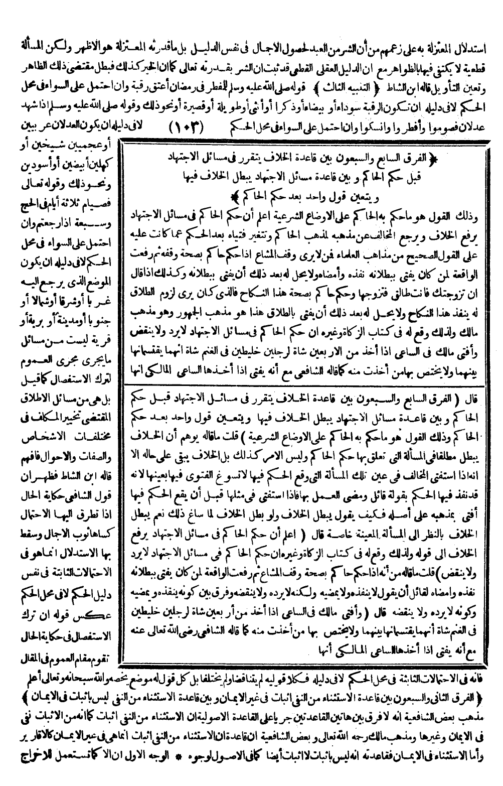 (الْفَرْقُ السَّابِعُ وَالسَّبْعُونَ بَيْنَ قَاعِدَةِ الْخِلَافُ يَتَقَرَّرُ فِي مَسَائِلِ الِاجْتِهَادِ قَبْلَ حُكْمِ الْحَاكِمِ وَبَيْنَ قَاعِدَةِ مَسَائِلُ الِاجْتِهَادِ يَبْطُلُ الْخِلَافُ فِيهَا وَيَتَعَيَّنُ قَوْلُ وَاحِدٍ بَعْدَ حُكْمِ الْحَاكِمِ) وَذَلِكَ الْقَوْلُ هُوَ مَا حَكَمَ بِهِ الْحَاكِمُ عَلَى الْأَوْضَاعِ الشَّرْعِيَّةِ اعْلَمْ أَنَّ حُكْمَ الْحَاكِمِ فِي مَسَائِلِ الِاجْتِهَادِ يَرْفَعُ الْخِلَافَ وَيَرْجِعُ الْمُخَالِفُ عَنْ مَذْهَبِهِ لِمَذْهَبِ الْحَاكِمِ وَتَتَغَيَّرُ فُتْيَاهُ بَعْدَ الْحُكْمِ عَمَّا كَانَتْ عَلَيْهِ عَلَى الْقَوْلِ الصَّحِيحِ مِنْ مَذَاهِبِ الْعُلَمَاءِ فَمَنْ لَا يَرَى وَقْفَ الْمُشَاعِ إذَا حَكَمَ حَاكِمٌ بِصِحَّةِ وَقْفِهِ ثُمَّ رُفِعَتْ الْوَاقِعَةُ لِمَنْ كَانَ يُفْتِي بِبُطْلَانِهِ نَفَّذَهُ وَأَمْضَاهُ وَلَا يَحِلُّ لَهُ بَعْدَ ذَلِكَ أَنْ يُفْتِيَ بِبُطْلَانِهِ وَكَذَلِكَ إذَا قَالَ إنْ تَزَوَّجْتُك فَأَنْتِ طَالِقٌ فَتَزَوَّجَهَا وَحَكَمَ حَاكِمٌ بِصِحَّةِ هَذَا النِّكَاحِ فَاَلَّذِي كَانَ يَرَى لُزُومَ الطَّلَاقِ لَهُ يُنْفِذُ هَذَا النِّكَاحَ وَلَا يَحِلُّ لَهُ بَعْدَ ذَلِكَ أَنْ يُفْتِيَ بِالطَّلَاقِ هَذَا هُوَ مَذْهَبُ الْجُمْهُورِ وَهُوَ مَذْهَبُ مَالِكٍ وَلِذَلِكَ وَقَعَ لَهُ فِي كِتَابِ الزَّكَاةِ وَغَيْرِهِ أَنَّ حُكْمَ الْحَاكِمِ فِي مَسَائِلِ الِاجْتِهَادِ لَا يُرَدُّ وَلَا يُنْقَضُ وَأَفْتَى مَالِكٌ فِي السَّاعِي إذَا أَخَذَ مِنْ الْأَرْبَعِينَ شَاةً لِرَجُلَيْنِ خَلِيطَيْنِ فِي الْغَنَمِ شَاةً أَنَّهُمَا يَقْتَسِمَانِهَا بَيْنَهُمَا وَلَا يَخْتَصُّ بِهَا مَنْ أُخِذَتْ مِنْهُ كَمَا قَالَهُ الشَّافِعِيُّ مَعَ أَنَّهُ يُفْتِي إذَا أَخَذَهَا السَّاعِي الْمَالِكِيُّ أَنَّهَا