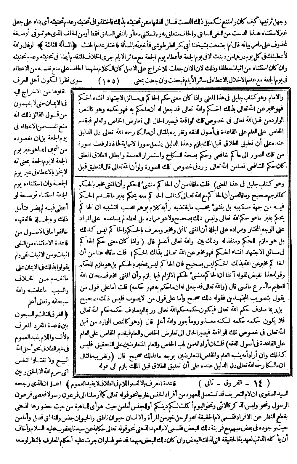(الْفَرْقُ الثَّالِثُ وَالسَّبْعُونَ بَيْنَ قَاعِدَةِ الْمُفْرَدُ الْمُعَرَّفُ بِالْأَلِفِ وَاللَّامِ يُفِيدُ الْعُمُومَ فِي غَيْرِ الطَّلَاقِ نَحْوُ {وَأَحَلَّ اللَّهُ الْبَيْعَ} [البقرة: 275] {وَلا تَقْتُلُوا النَّفْسَ الَّتِي حَرَّمَ اللَّهُ إِلا بِالْحَقِّ} [الأنعام: 151] وَبَيْنَ قَاعِدَةِ الْمُعَرَّفُ بِالْأَلِفِ وَاللَّامِ فِي الطَّلَاقِ لَا يُفِيدُ الْعُمُومَ) اعْلَمْ أَنَّ الَّذِي رَجَّحَهُ السَّيِّدُ الصَّفَوِيُّ أَنَّ لَامَ التَّعْرِيفِ قَدْ تُسْتَعْمَلُ لِلْمَعْهُودِ مِنْ أَفْرَادِ الْجِنْسِ خَارِجًا نَحْوُ قَوْله تَعَالَى {كَمَا أَرْسَلْنَا إِلَى فِرْعَوْنَ رَسُولا} [المزمل: 15] {فَعَصَى فِرْعَوْنُ الرَّسُولَ} [المزمل: 16] وَنَحْوُ {وَلَيْسَ الذَّكَرُ كَالأُنْثَى} [آل عمران: 36] وَنَحْوُ {الْيَوْمَ أَكْمَلْتُ لَكُمْ دِينَكُمْ} [المائدة: 3] أَوْ لِلْجِنْسِ أَمَّا مِنْ حَيْثُ هُوَ أَيْ لِلْمَاهِيَةِ مِنْ حَيْثُ حُضُورُهَا الذِّهْنِيُّ بِقَطْعِ النَّظَرِ عَنْ الْأَفْرَادِ فَتُسَمَّى لَامَ الْحَقِيقَةِ نَحْوُ الرَّجُلُ خَيْرٌ مِنْ الْمَرْأَةِ وَالْإِنْسَانُ حَيَوَانٌ نَاطِقٌ وَالْحَيَوَانُ جِنْسٌ وَالنَّاطِقُ فَصْلٌ.