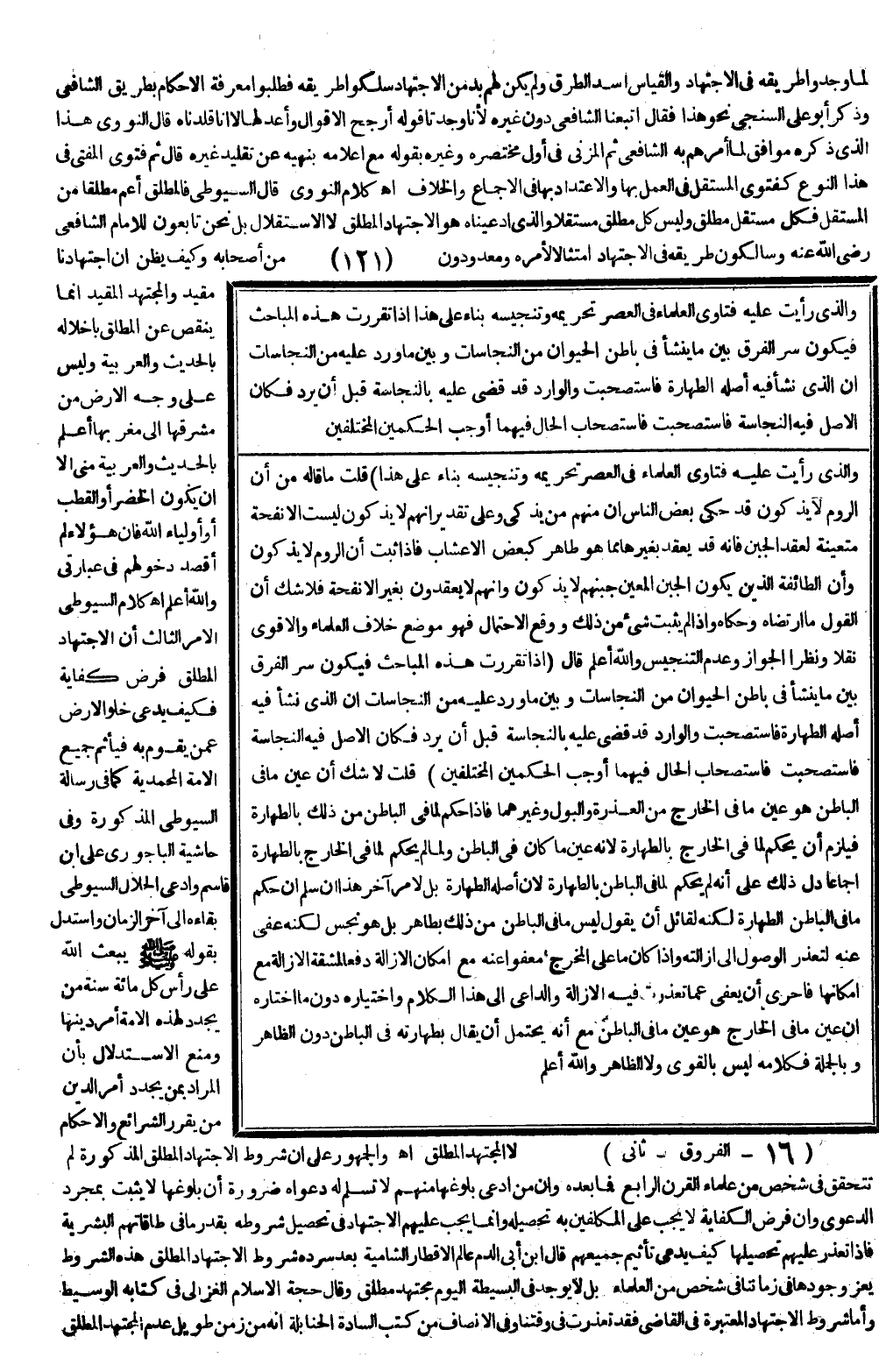هَذَا الَّذِي ذَكَرَهُ مُوَافِقٌ لِمَا أَمَرَهُمْ بِهِ الشَّافِعِيُّ ثُمَّ الْمُزَنِيّ فِي أَوَّلِ مُخْتَصَرِهِ وَغَيْرُهُ بِقَوْلِهِ مَعَ إعْلَامِهِ بِنَهْيِهِ عَنْ تَقْلِيدِ غَيْرِهِ قَالَ ثُمَّ فَتْوَى الْمُفْتِي فِي هَذَا النَّوْعِ كَفَتْوَى الْمُسْتَقِلِّ فِي الْعَمَلِ بِهَا وَالِاعْتِدَادِ بِهَا فِي الْإِجْمَاعِ وَالْخِلَافِ اهـ كَلَامُ النَّوَوِيِّ قَالَ السُّيُوطِيّ فَالْمُطْلَقُ أَعَمُّ مُطْلَقًا مِنْ الْمُسْتَقِلِّ فَكُلُّ مُسْتَقِلٍّ مُطْلَقٌ وَلَيْسَ كُلُّ مُطْلَقٍ مُسْتَقِلًّا وَاَلَّذِي ادَّعَيْنَاهُ هُوَ الِاجْتِهَادُ الْمُطْلَقُ لَا الِاسْتِقْلَالُ بَلْ نَحْنُ تَابِعُونَ لِلْإِمَامِ الشَّافِعِيِّ - رَضِيَ اللَّهُ عَنْهُ - وَسَالِكُونَ طَرِيقَهُ فِي الِاجْتِهَادِ امْتِثَالًا لِأَمْرِهِ وَمَعْدُودُونَ مِنْ أَصْحَابِهِ وَكَيْفَ يُظَنُّ أَنَّ اجْتِهَادَنَا مُقَيَّدٌ وَالْمُجْتَهِدُ الْمُقَيَّدُ إنَّمَا يَنْقُصُ عَنْ الْمُطْلَقِ بِإِخْلَالِهِ بِالْحَدِيثِ وَالْعَرَبِيَّةِ وَلَيْسَ عَلَى وَجْهِ الْأَرْضِ مِنْ مَشْرِقِهَا إلَى مَغْرِبِهَا أَعْلَمُ بِالْحَدِيثِ وَالْعَرَبِيَّةِ مِنِّي إلَّا أَنْ يَكُونَ الْخَضِرُ أَوْ الْقُطْبُ أَوْ أَوْلِيَاءُ اللَّهِ فَإِنَّ هَؤُلَاءِ لَمْ أَقْصِدْ دُخُولَهُمْ فِي عِبَارَتِي وَاَللَّهُ أَعْلَمُ اهـ كَلَامُ السُّيُوطِيّ الْأَمْرُ الثَّالِثُ أَنَّ الِاجْتِهَادَ الْمُطْلَقَ فَرْضُ كِفَايَةٍ فَكَيْفَ يَدَّعِي خُلُوَّ الْأَرْضِ عَمَّنْ يَقُومُ بِهِ فَيَأْثَمُ جَمِيعُ الْأُمَّةِ الْمُحَمَّدِيَّةِ كَمَا فِي رِسَالَةِ السُّيُوطِيّ الْمَذْكُورَةِ وَفِي حَاشِيَةِ الْبَاجُورِيِّ عَلَى ابْنِ قَاسِمٍ وَادَّعَى الْجَلَالُ السُّيُوطِيّ بَقَاءَهُ إلَى آخِرِ الزَّمَانِ وَاسْتَدَلَّ بِقَوْلِهِ - صَلَّى اللَّهُ عَلَيْهِ وَسَلَّمَ - «يَبْعَثُ اللَّهُ عَلَى رَأْسِ كُلِّ مِائَةِ سَنَةٍ مَنْ يُجَدِّدُ لِهَذِهِ الْأُمَّةِ أَمْرَ دِينِهَا» وَمَنَعَ الِاسْتِدْلَالَ بِأَنَّ الْمُرَادَ بِمَنْ يُجَدِّدُ أَمْرَ الدِّينِ مَنْ يُقَرِّرُ الشَّرَائِعَ وَالْأَحْكَامَ لَا الْمُجْتَهِدَ الْمُطْلَقَ اهـ.