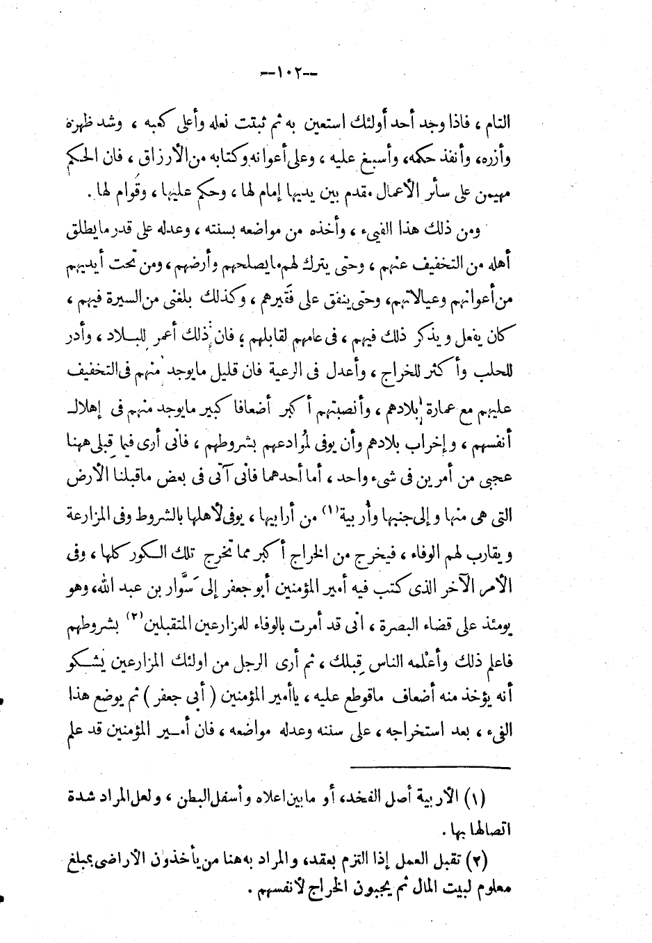 وفي الأمر الآخر الذي كتب فِيْهِ أمير المؤمنين أَبُو جعفر إِلَى سوار بْن عَبْد اللهِ، وهو يومئذ على قضاء البصرة، إني قد أمرت بالوفاء للمزارعين المتقبلين بشروطهم فاعلم ذلك وأعمله الناس قبلك، ثم أرى الرجل من أولئك المزارعين يشكو أنه يؤخذ منه أضعاف ما قوطع عليه، يا أمير المؤمنين أبي جعفر ثم يوضع هَذَا الفىء، بعد استخراجه، على سننه وعدله مواضعه، فإن أمير المؤمنين قد علم