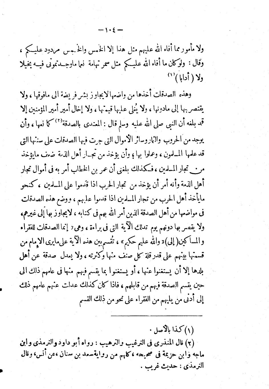 ولا مأمور مما أفاء الله عليهم مثل هَذَا إِلَّا الخمس والخمس مردود عليكم، وقال: ولو كان ما أفاء الله عليكم مثل سمر تهامة نعماً ما وجدتموني فِيْهِ بخيلاً ولا أداباً وهذه الصدقات أخذها من واضعها لا يجاوز بشر فريضة إِلَى ما فوقها، ولا يقتصر بها إِلَى ما دونها، ولا يغلى عليها قيمتها، ولا إخال أمير أمير المؤمنين إِلَّا قد بلغه أَنَّ النَّبِيَّ صَلَّى اللَّهُ عَلَيْهِ وَسَلَّمَ قال: المعتدى بالصدقة كما نعها، وأن يوجد من الحروب والثمار وسائر الأموال التي جرت فيها الصدقات على سننها التي قد علمها المسلمون، وعملوا بها؛ وأن يؤخذ من تجار أهل الذمة ضعف ما يؤخذ من تجار المسلمين.
