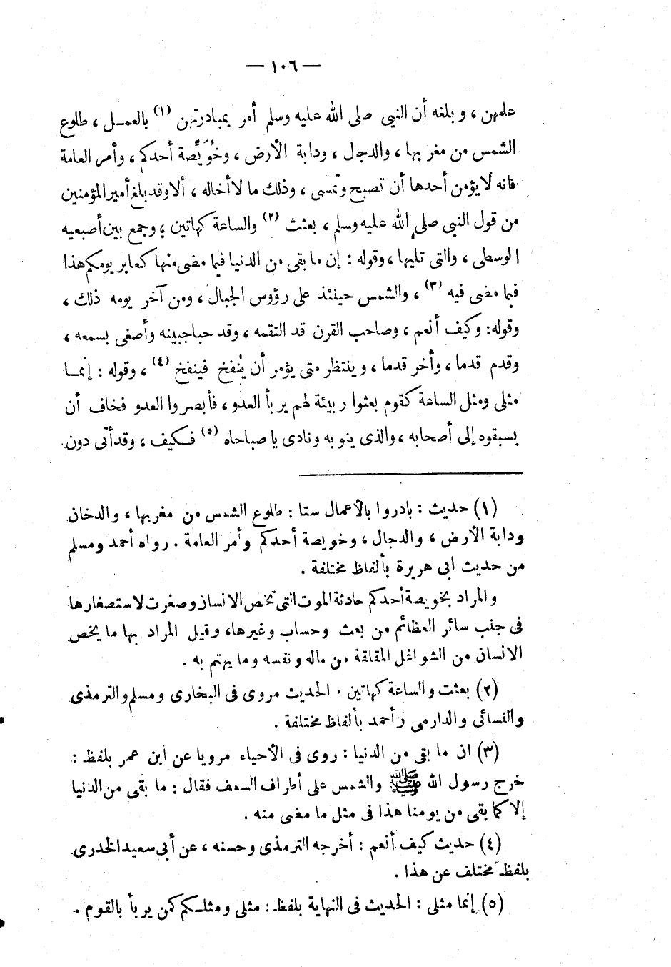علمهن، وبلغه أَنَّ النَّبِيَّ صَلَّى اللَّهُ عَلَيْهِ وَسَلَّمَ أمر بمبادرتهن بالعمل، طلوع الشمس من مغربها، والدجل، ودابة الأرض، وخويصة أحدكم، وأمر العامة فإنه لا يؤمن أحدها أن تصبح وتمسي، وذلك ما لا أخاله، ألا وقد بلغ أمير المؤمنين من قول النبي صَلَّى اللَّهُ عَلَيْهِ وَسَلَّمَ، بعثت والساعة كهاتين؛ وجمع بين أصبعيه الوسطى، والتي تليها، وقوله: إن ما بقي من الدنيا فيما مضى منها كعابر يومكم هَذَا فيما مضى فيه، والشمس حينئذ على رؤوس الجبال، ومن آخر يومه ذلك، وقوله: وكيف أنعم، وصاحب القرن قد التقمه، وقد حبا جبينه وأصغى بسمعه، وقدم قدماً، وأخر قدماً، وينتظر متى يؤمر أن ينفخ فينفخ، وقوله: إنما مثلي ومثل الساعة كقوم بعثوا ربيئة لهم يربأ العدو، فأبصروا العدو فخاف أن يسبقوه إِلَى أصحابه، والذي ينوبه ونادى يا صباحاه فكيف، وقد أتى دون
