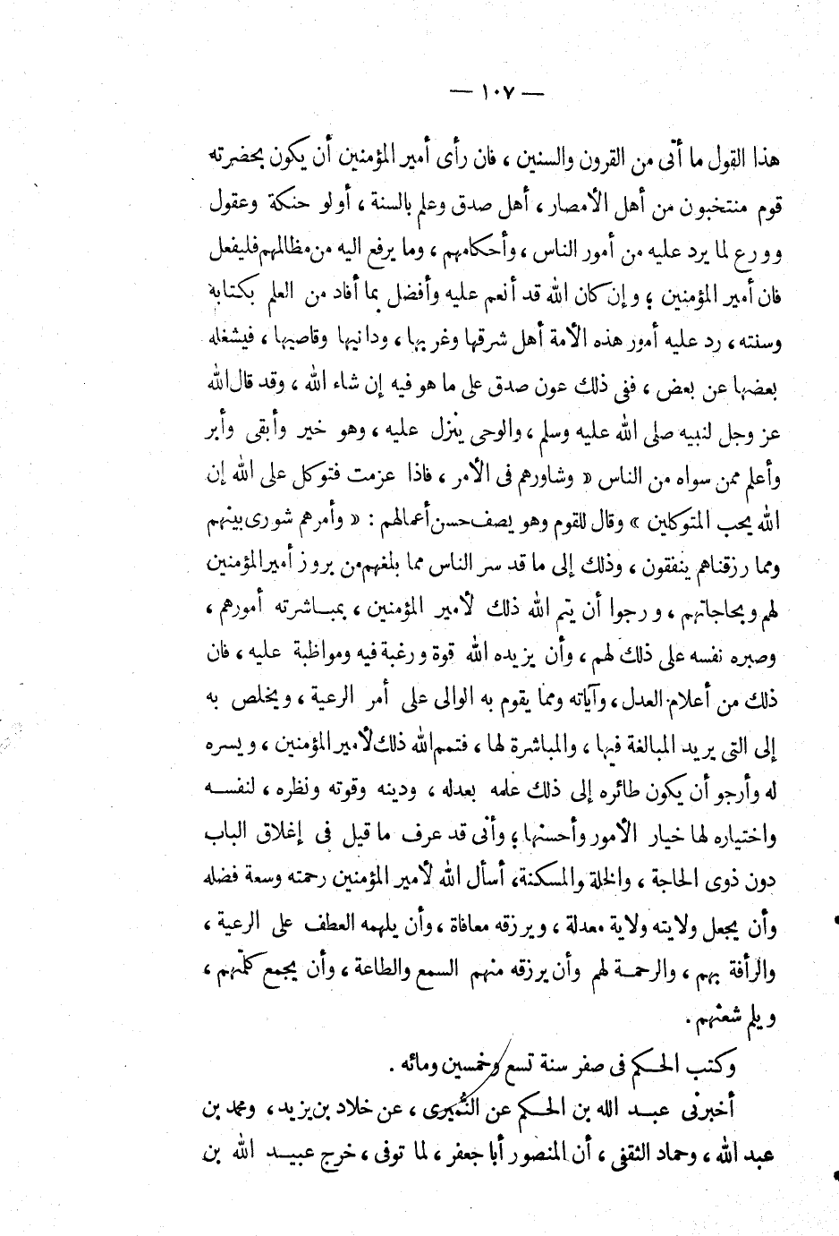 هَذَا القول ما أتى من القرون والسنين، فإن رأى أمير المؤمنين أن يكون بحضرته قوم منتخبون من أهل الأمصار، أهل صدق وعلم بالسنة، أولو حنكة وعقول وورع لما يرد عليه من أمور الناس، وأحكامهم، وما يرفع إليه من مظالمهم فليفعل فإن أمير المؤمنين؛ وإن كان الله قد أنعم عليه وأفضل بما أفاد من العلم بكتابه وسنته، رد عليه أمور هذه الأمة أهل شرقها وغربها، ودانيها وقاصيها، فيشغله بعضها عَن بعض، ففي ذلك عون صدق على ما هو فِيْهِ إن شاء الله، وقد قَالَ: الله عز وجل لنبيه صَلَّى اللَّهُ عَلَيْهِ وَسَلَّمَ، والوحي ينزل عليه، وهو خير وأبقى وأبر وأعلم ممن سواه من الناس: {وَشَاوِرْهُمْ فِي الأَمْرِ فَإِذَا عَزَمْتَ فَتَوَكَّلْ عَلَى اللهِ إِنَّ اللهَ يُحِبُّ الْمُتَوَكِّلِينَ [آل عِمْرَان: 159]