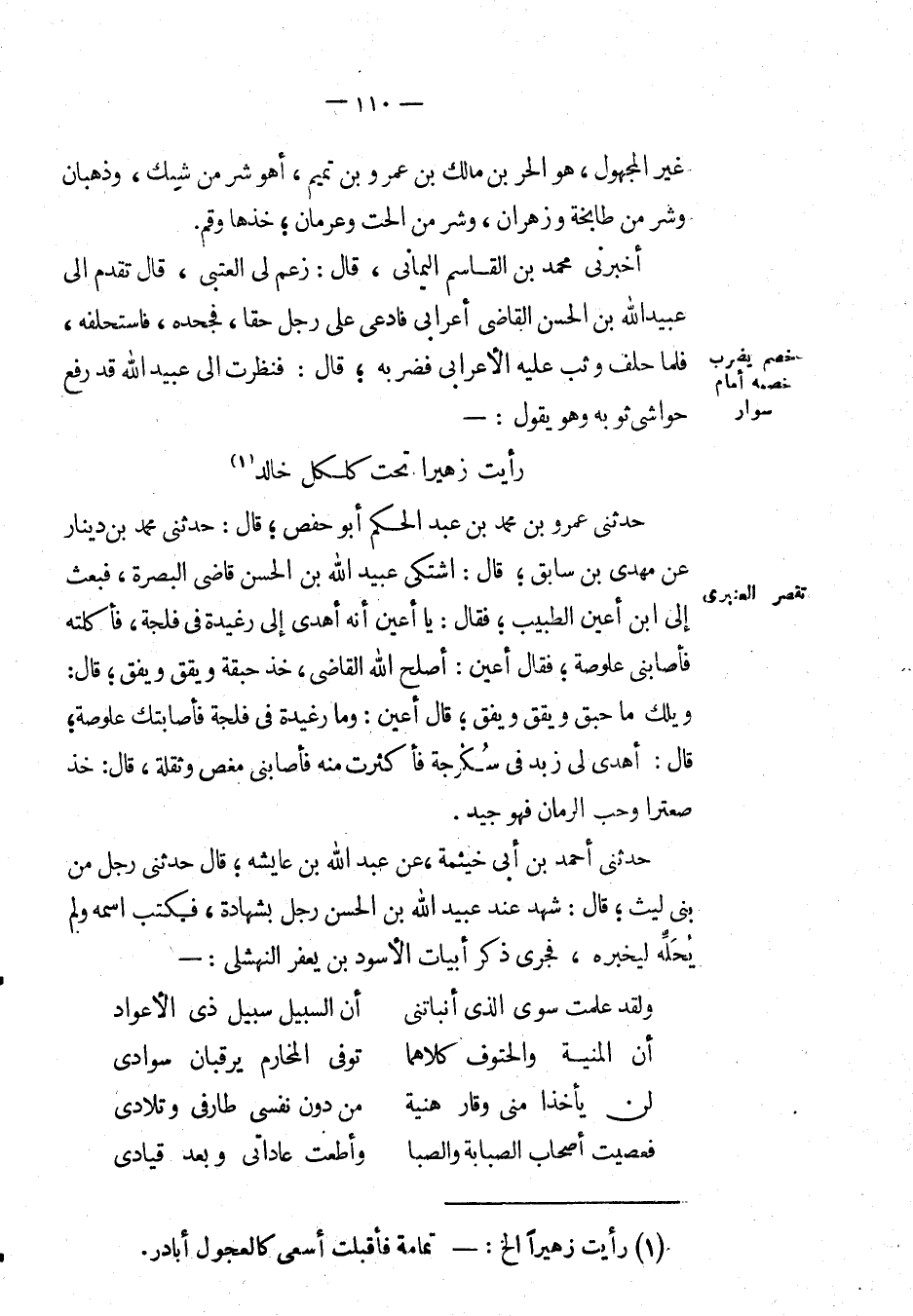 حَدَّثَنِي أَحْمَد بْن أبي خيثمة، عَنْ عَبْدِ اللهِ بْن عايشه؛ قَالَ: حَدَّثَنِي رجل من بني ليث؛ قال: شهد عند عبيد الله بْن الْحَسَن رجل بشهادة، فكتب اسمه ولم يحله ليخبره، فجرى ذكر أبيات الأسود بْن يعفر النهشلي: