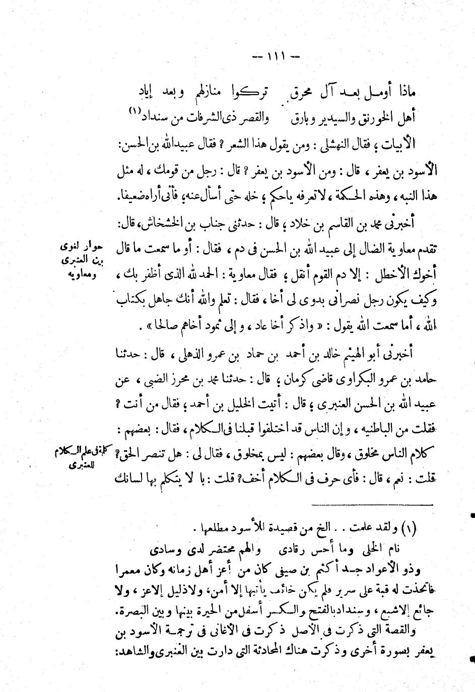 أَخْبَرَنِي أَبُو الهيثم خالد بْن أَحْمَد بْن حماد بْن عَمْرو الذهلي، قال: حَدَّثَنَا حامد بْن عَمْرو البكراوي قاضي كرمان؛ قال: حَدَّثَنَا مُحَمَّد بْن محرز الضبي، عَن عبيد الله بْن الْحَسَن العنبري؛ قال: أتيت الخليل بْن أَحْمَد؛ فَقَالَ: من أنت ? فقلت من الباطنيه، وإن الناس قد اختلفوا قبلنا في الكلام، فقال: بعضهم: كلام الناس مخلوق، وقَالَ: بعضهم: ليس بمخلوق، فَقَالَ لي: هَلْ تنصر الحق ? قلت: نعم، قال: فأي حرف في الكلام أخف ? قلت:"با" لا يتكلم بها لسانك