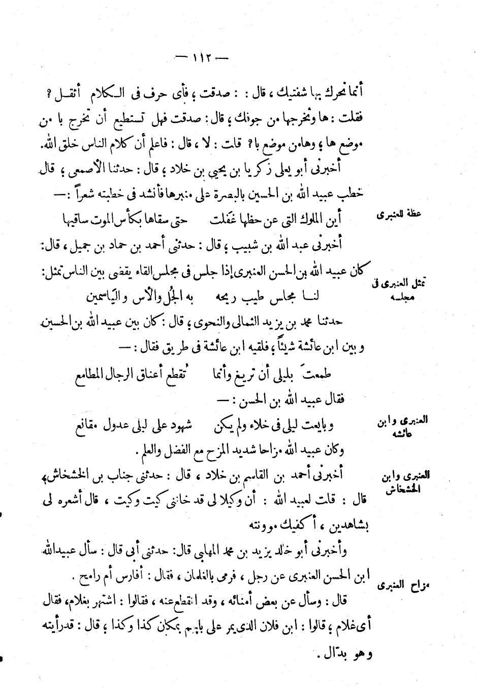 حَدَّثَنَا مُحَمَّد بْن يزيد الثمالي والنحوي؛ قال: كان بين عبيد الله بْن الحسين وبين ابن عَائِشَة شيئاً؛ فلقيه ابن عَائِشَة في طريق فقال: