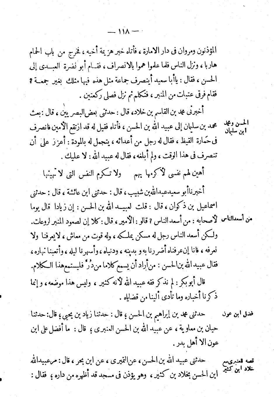 حَدَّثَنِي مُحَمَّد بْن إبراهيم بْن الْحَسَن؛ قال: حَدَّثَنَا زِيَاد بْن يحيى؛ قال: حَدَّثَنَا حيان بْن معاوية، عَن عبيد الله بْن الْحَسَن العنبري؛ قال: ما أفضل على ابن عون إِلَّا أهل بدر.