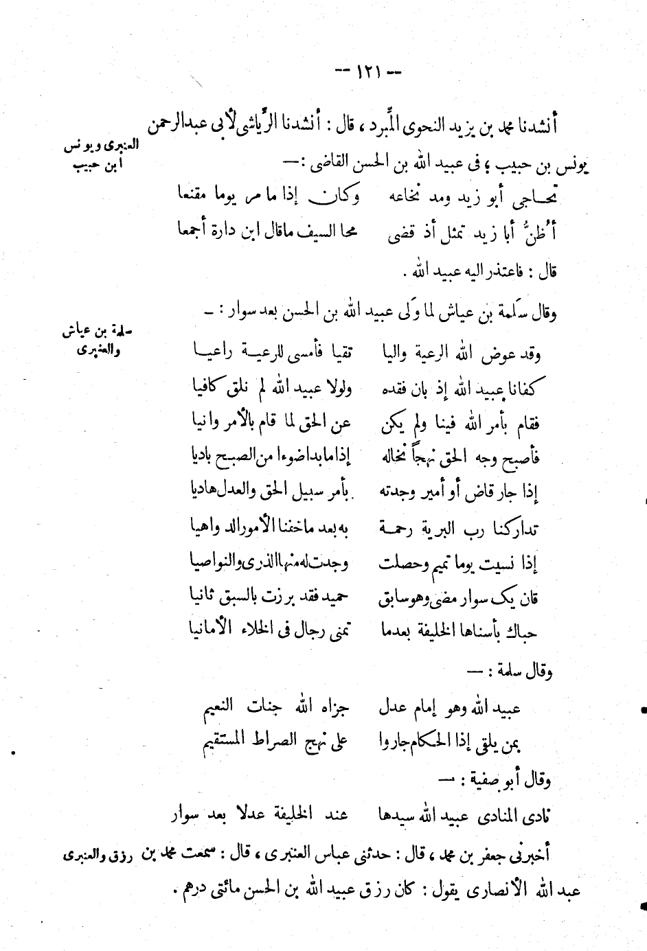 أنشدنا مُحَمَّد بْن يزيد النحوي المبرد، قال: أنشدنا الرياشي لأبي عَبْد الرحمن يونس بْن حبيب؛ في عبيد الله بْن الْحَسَن القاضي: