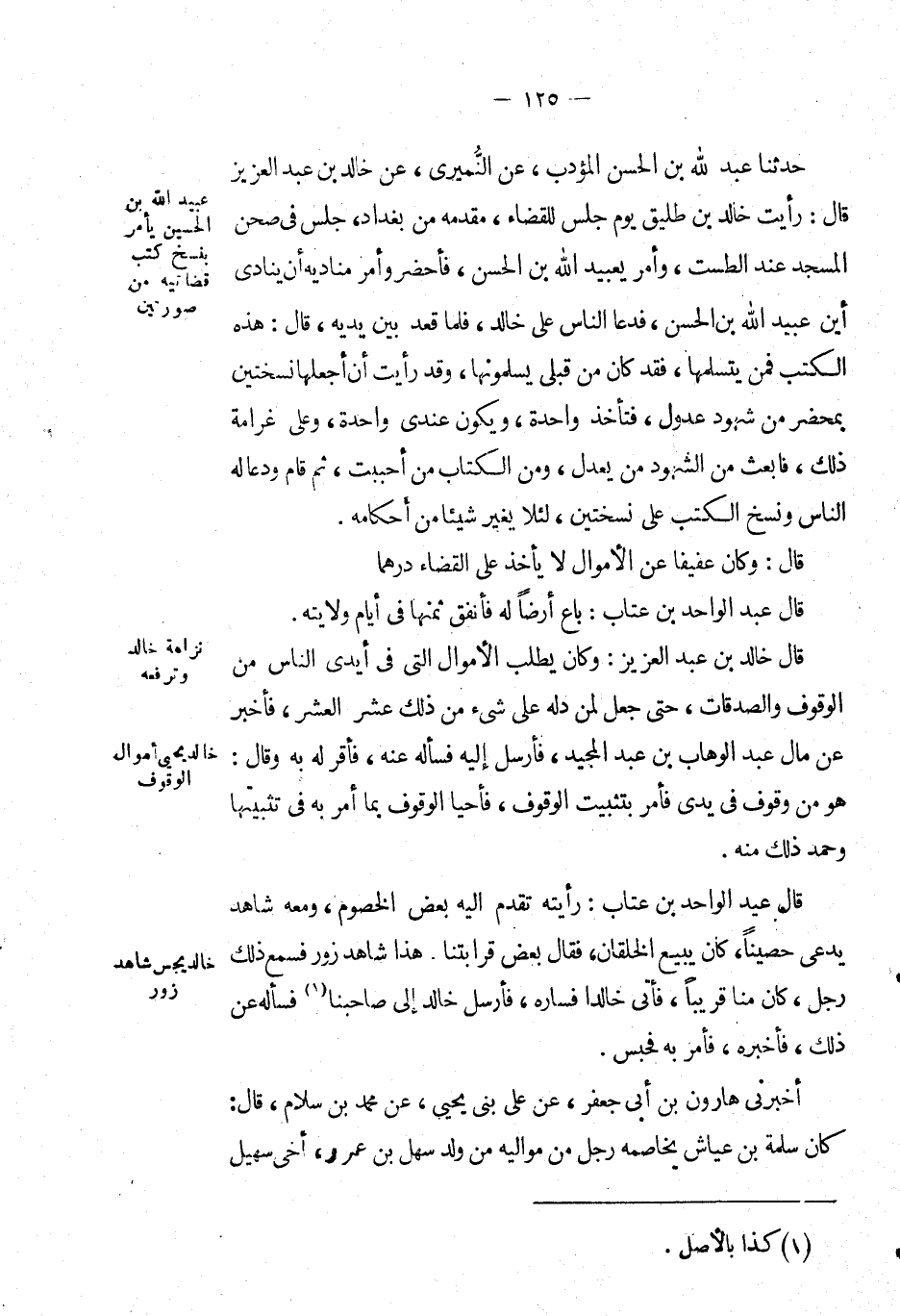 حَدَّثَنَا عَبْدُ لله بْن الْحَسَن المؤدب، عَن النميري، عَن خالد بْن عَبْد العزيز قال: رأيت خالد بْن طليق يوم جلس للقضاء، مقدمه من بغداد، جلس في صحن المسجد عند الطست، وأمر بعبيد الله بْن الْحَسَن، فأحضر وأمر مناديه أن ينادي: أين عبيد الله بْن الْحَسَن؟ فدعا الناس على خالد، فلما قعد بين يديه، قال: هذه الكتب فمن يتسلمها، فقد كان من قبلي يسلمونها، وقد رأيت أن أجعلها نسختين بمحضر من شهود عدول، فتأخذ واحدة، ويكون عندي واحدة، وعلى غرامة ذلك، فابعث من الشهود من يعدل، ومن الكتاب من أحببت، ثم قام ودعا له الناس ونسخ الكتب على نسختين، لئلا يغير شيئاً من أحكامه.