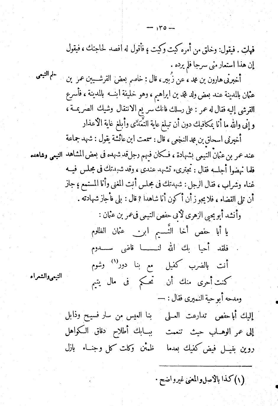 أَخْبَرَنِي إسحاق بْن مُحَمَّد النخعي، قال: سمعت ابن عَائِشَة يقول: شهد جماعة عند عُمَر بْن عُثْمَان التيمي بشهادة، فان فيهم رجل قد شهده في بعض المشاهد فلما نهضوا أجلسه فقال: تجترىء تشهد عندي، وقد شهدتك في مجلس فِيْهِ غناء وشراب، فَقَالَ: الرجل: شهدتك في مجلس أنت المغني وأنا المستمع؛ جاز أن تلي القضاء، فلا يجوز أن أكون أنا شاهداً ? قال: بلى فأجاز شهادته. وأنشد أَبُو يحيى الزهري لأبي حفص التيمي في عُمَر بْن عثمان: