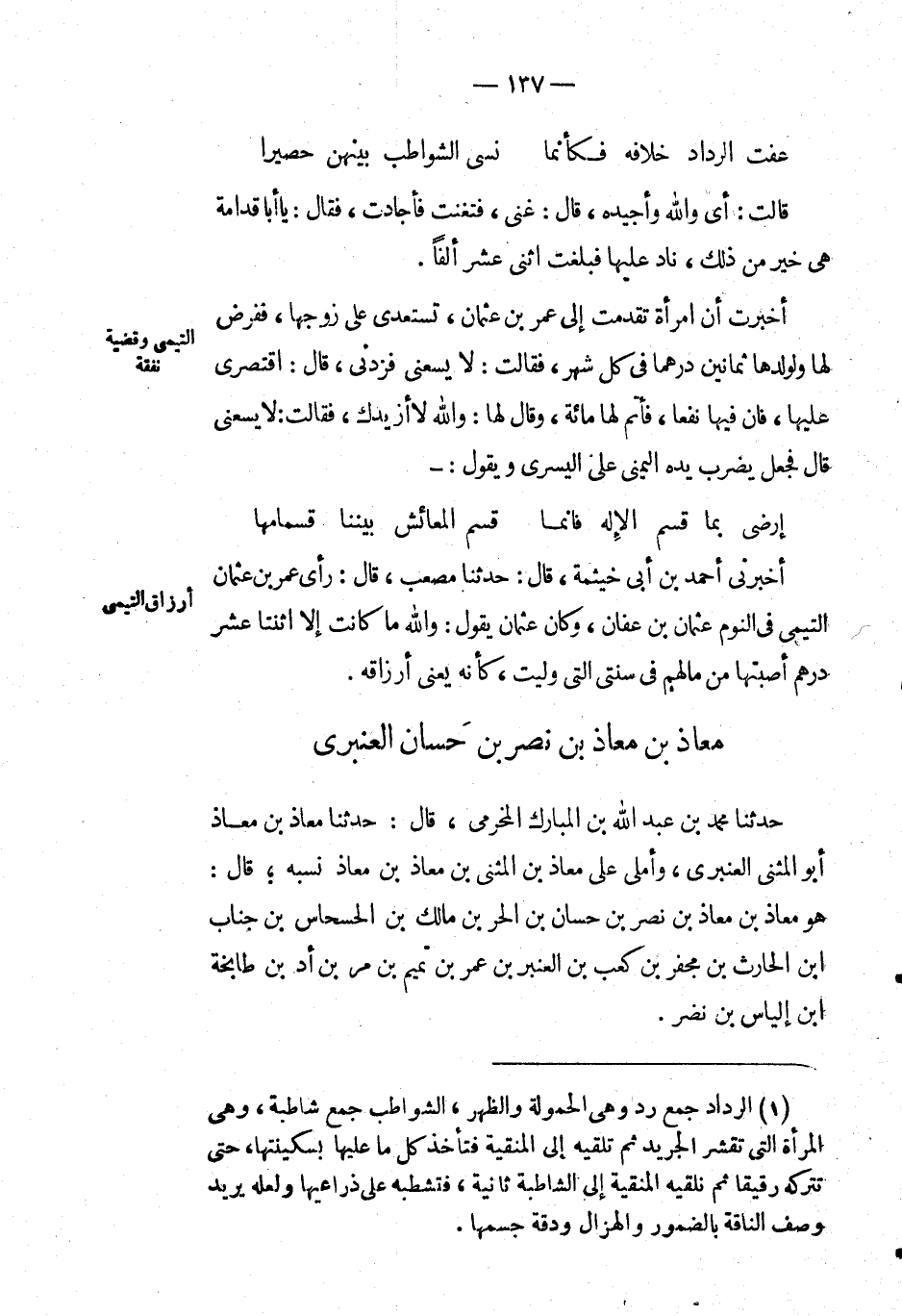 حَدَّثَنَا مُحَمَّد بْن عَبْد اللهِ بْن المبارك المخرمي، قال: حَدَّثَنَا معاذ بْن معاذ أَبُو المثنى العنبري، وأملى علي معاذ بْن المثنى بْن معاذ بْن معاذ نسبه؛ قال: هو معاذ بْن معاذ بْن نصر بْن حسان بْن الحر بْن مالك بْن الحسحاس بْن جناب ابن الحارث بْن مجفر بْن كعب بْن العنبر بْن عُمَر بْن تميم بْن مر بْن أد بْن طابخة ابن إلياس بْن نضر.