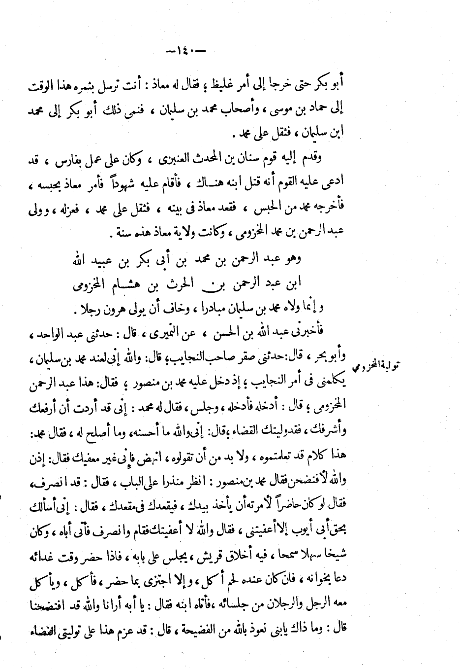 أَبُو بكر حتى خرجا إِلَى أمر غليظ؛ فَقَالَ لَهُ معاذ: أنت ترسل بثمره هَذَا الوقت إِلَى حماد بْن موسى، وأصحاب مُحَمَّد بْن سليمان، فنمى ذلك أَبُو بكر إِلَى مُحَمَّد ابن سليمان، فثقل على مُحَمَّد. وقدم إليه قوم سنان بْن المحدث العنبري، وكان على عمل بفارس، قد ادعى عليه القوم أنه قتل ابنه هناك، فأقام عليه شهوداً فأمر معاذ بحبسه، فأخرجه مُحَمَّد من الحبس، فقعد معاذ في بيته، فثقل على مُحَمَّد، فعزله، وولى عَبْد الرحمن بْن مُحَمَّد المخزومي، وكانت ولاية معاذ هذه سنة. وهو عَبْد الرحمن بْن مُحَمَّد بْن أبي بكر بْن عبيد الله ابن عَبْد الرحمن بْن الحرث بْن هشام المخزومي وإنما ولاه مُحَمَّد بْن سليمان مبادراً، وخاف أن يولى هارون رجلاً.