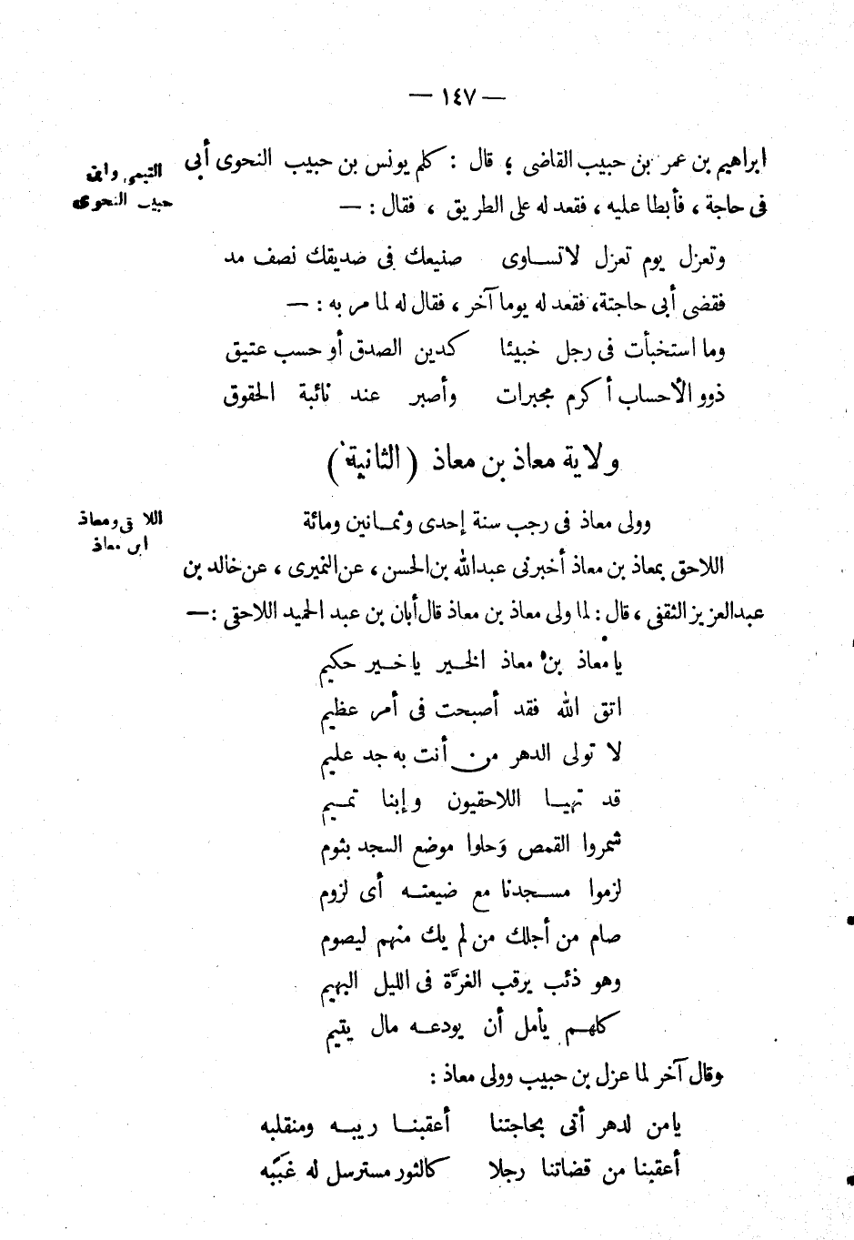 وولى معاذ في رجب سنة إحدى وثمانين ومائة اللاحق بمعاذ بْن معاذ أَخْبَرَنِي عَبْد اللهِ بْن الْحَسَن، عَن النميري، عَن خالد بْن عَبْد العزيز الثقفي، قال: لما ولى معاذ بْن معاذ قَالَ: أبان بْن عَبْد الحميد اللاحقي: