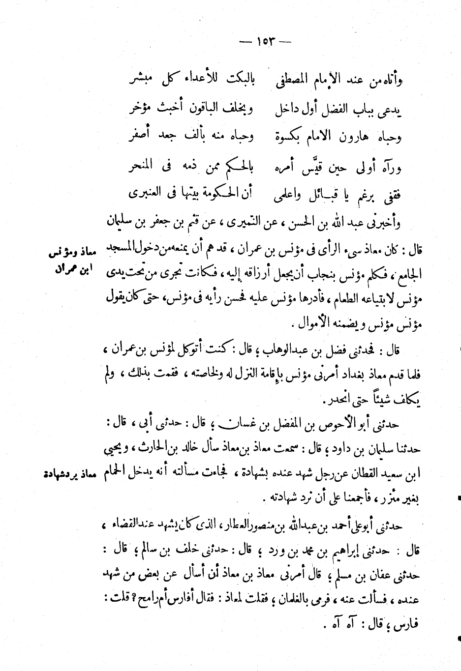 وأَخْبَرَنِي عَبْد اللهِ بْن الْحَسَن، عَن النميري، عَن قثم بْن جعفر بْن سليمان قال: كان معاذ سيء الرأي في مؤنس بْن عِمْرَانَ، قد هم أن يمنعه من دخول المسجد الجامع، فكلم مؤنس بنجاب أن يجعل أرزاقه إليه، فكانت تجري من تحت يدي مؤنس لابتياعه الطعام، فأدرها مؤنس عليه فحسن رأيه في مؤنس، حتى كان يقول: مؤنس مؤنس ويضمنه الأموال.