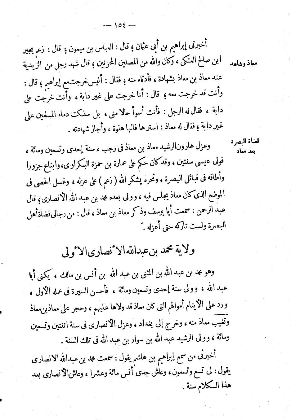 وهو مُحَمَّد بْن عَبْد اللهِ بْن المثنى بْن عَبْد اللهِ بْن أنس بْن مالك، يكنى أبا عَبْد اللهِ، وولى سنة إحدى وتسعين ومائة، فأحسن السيرة في عمله الأول، ورد على الأيتام أموالهم التي كان معاذ قد ولاها عليهم، وحجر على معاذ بْن معاذ وتغيب معاذ منه، وخرج إِلَى بغداد، وعزل الأنصاري في سنة اثنتين وتسعين ومائة، وولى الرشيد عَبْد اللهِ بْن سوار بْن عَبْد اللهِ في تلك السنة.