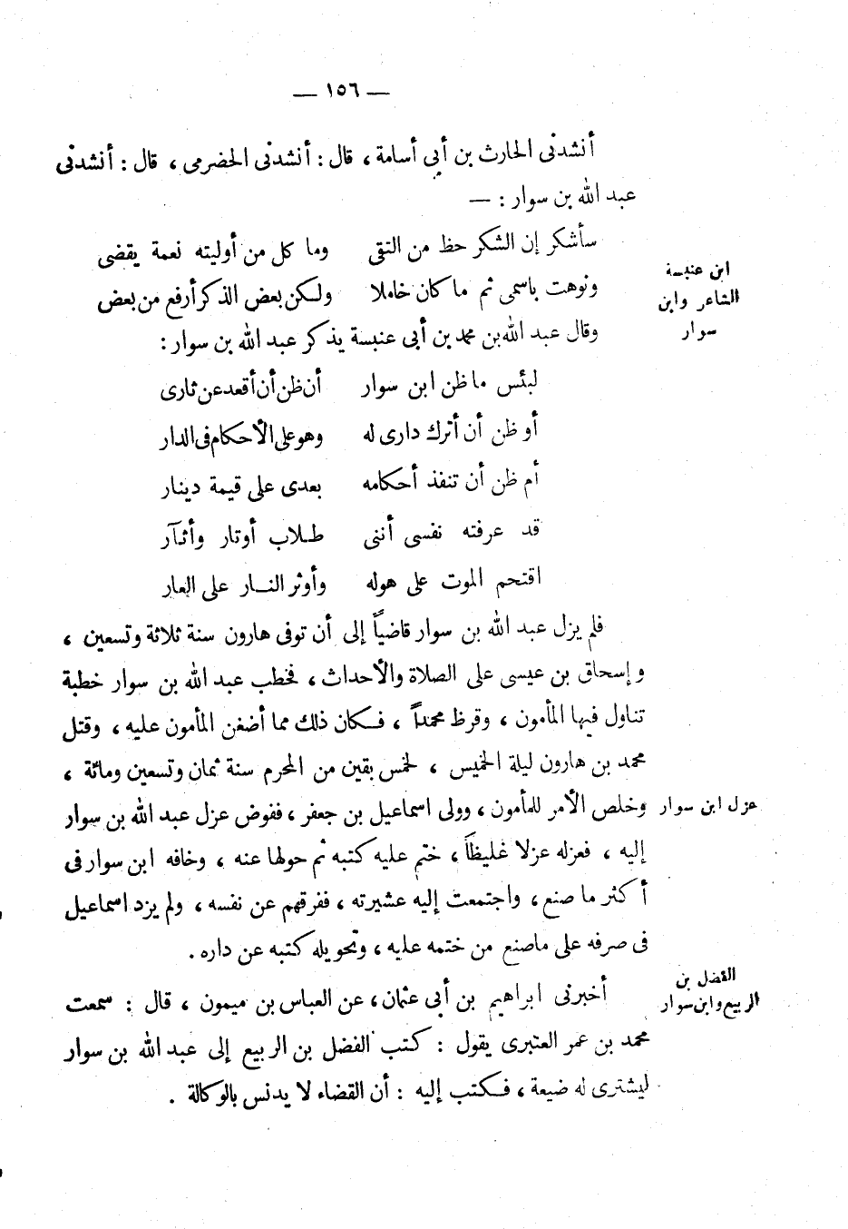 وقَالَ: عَبْد اللهِ بْن مُحَمَّد بْن أبي عنبسة يذكر عَبْد اللهِ بْن سوار: