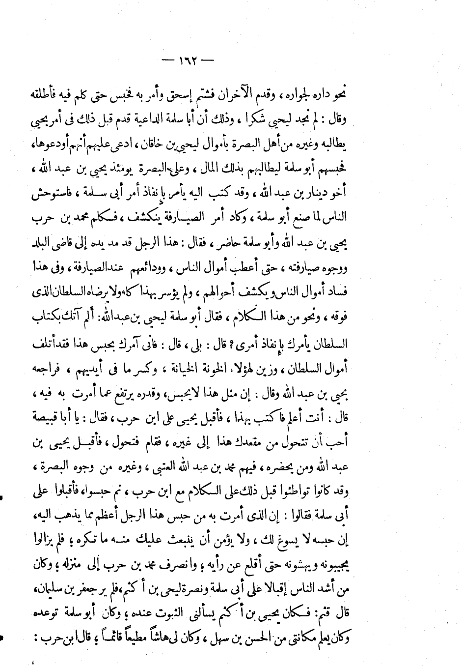 نحو داره لجواره، وقدم الآخران فشتم إسحاق وأمر به فحبس حتى كلم فِيْهِ فأطلقه وقال: لم نجد ليحيى شكراً، وذلك أن أبا سلمة الداعية قدم قبل ذلك في أمر يحيى يطالبه وغيره من أهل البصرة بأموال ليحيى بْن خاقان، ادعى عليهم أنهم أودعوها، فحبسهم أَبُو سلمة ليطالبهم بذلك المال، وعلى البصرة يومئذ يحيى بْن عَبْد اللهِ، أخو دينار بْن عَبْد اللهِ، وقد كتب إليه يأمر بإنفاذ أمر أبي سلمة، فاستوحش الناس لما صنع أَبُو سلمة، وكاد أمر الصيارفة ينكشف، فكلم مُحَمَّد بْن حرب يحيى بْن عَبْد اللهِ وأَبُو سلمة حاضر، فقال: هَذَا الرجل قد مد يده إِلَى قاضي البلد ووجوه صيارفته، حتى أعطب أموال الناس، وودائعهم عند الصيارفة، وفي هَذَا فساد أموال الناس ويكشف أحوالهم، ولم يؤسر بهَذَا كله ولا يرضاه السلطان الذي فوقه، ونحو من هَذَا الكلام.