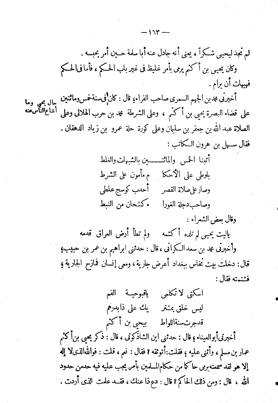 لم نجد ليحيى شكراً، يعني أنه جادل عنه أبا سلمة حين أمر بحبسه. وكان يحيى بْن أكثم يرمي بأمر غليظ في غير باب الحكم، فأما في الحكم فهيهات أن يرام.