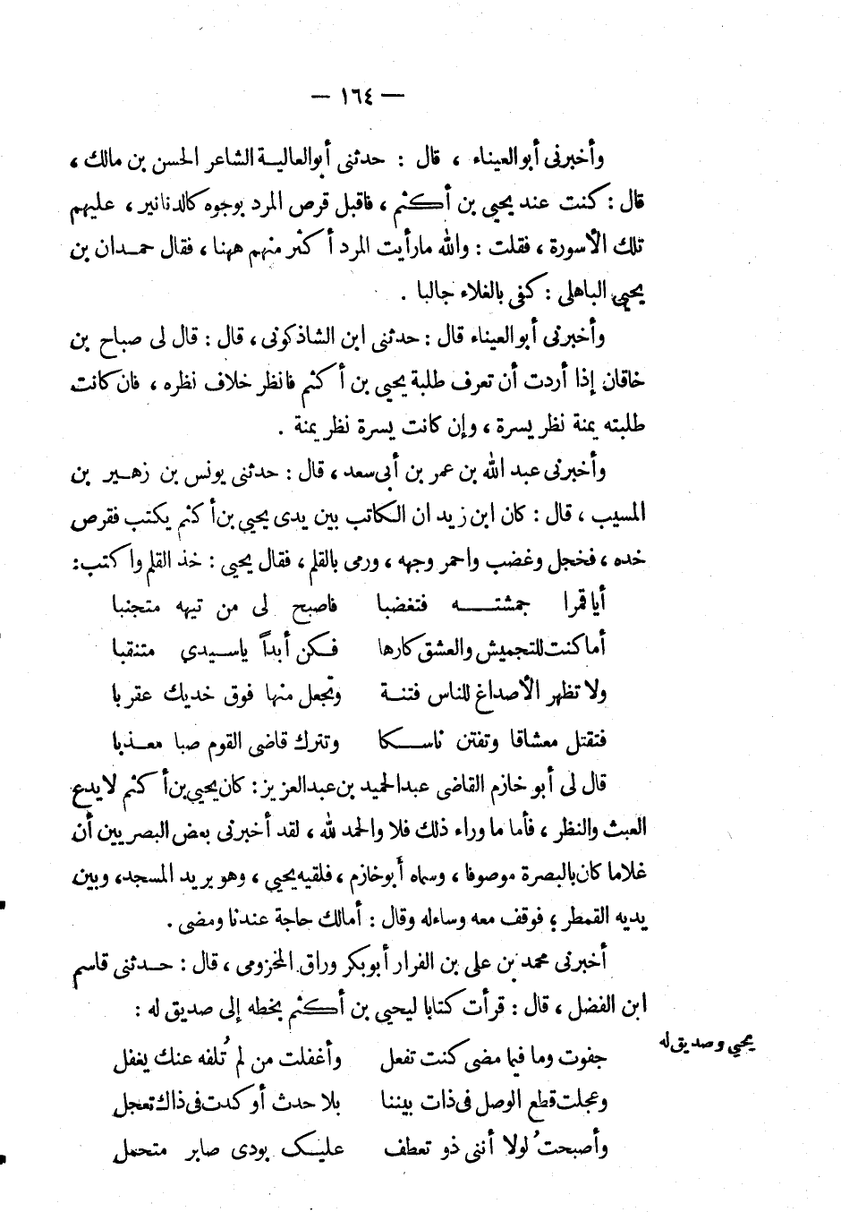 وأَخْبَرَنِي عَبْد اللهِ بْن عُمَر بْن أبي سعد، قال: حَدَّثَنِي يونس بْن زهير بْن المسيب، قال: كان ابن زيد أن الكاتب بين يدي يحيى بْن أكثم يكتب فقرص خده، فخجل وغضب واحمر وجهه، ورمى بالقلم، فَقَالَ: يحيى: خذ القلم واكتب: