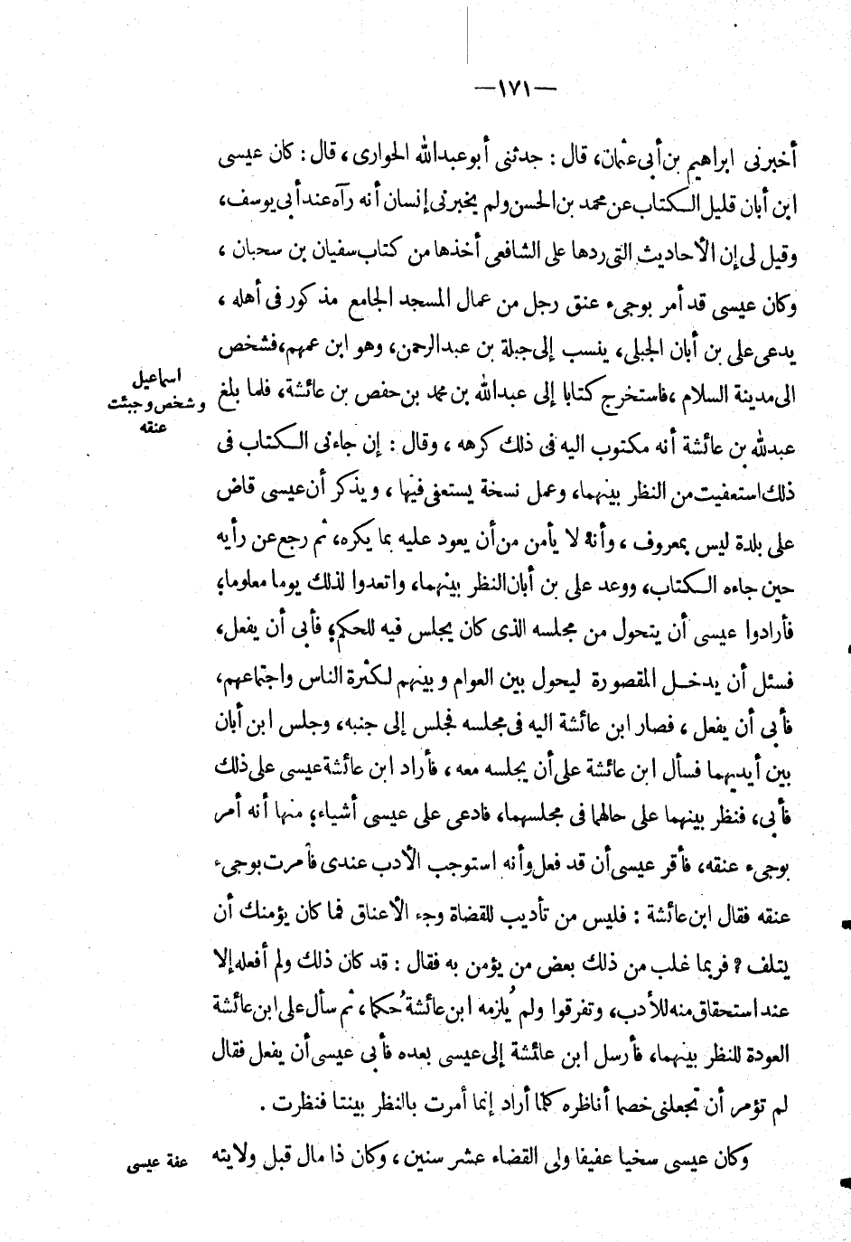 أَخْبَرَنِي إبراهيم بْن أبي عثمان، قال: حَدَّثَنِي أَبُو عَبْد اللهِ الحواري، قال: كن عيسى ابن أبان قليل الكتاب عَن مُحَمَّد بْن الْحَسَن ولم يخبرني إنسان أنه رآه عند أبي يوسف، وقيل لي إن الأحاديث التي ردها على الشافعي أخذها من كتاب سُفْيَان بْن سحبان، وكان عيسى قد أمر بوجىء عنق رجل من عمال المسجد الجامع مذكور في أهله، يدعى علي بْن أبيان الجبلي، ينسب إِلَى جبلة بْن عَبْد الرحمن، وهو ابن عمهم، فشخص إِلَى مدين السلام، فاستخرج كتاباً إِلَى عَبْدِ اللهِ بْن مُحَمَّد بْن حفص بْن عَائِشَة، فلما بلغ عَبْد اللهِ بْن عَائِشَة أنه مكتوب إليه في ذلك كرهه، وقال: إن جاءني الكتاب في ذلك استعفيت من النظر بينهما، وعمل نسخة يستعفى فيها.