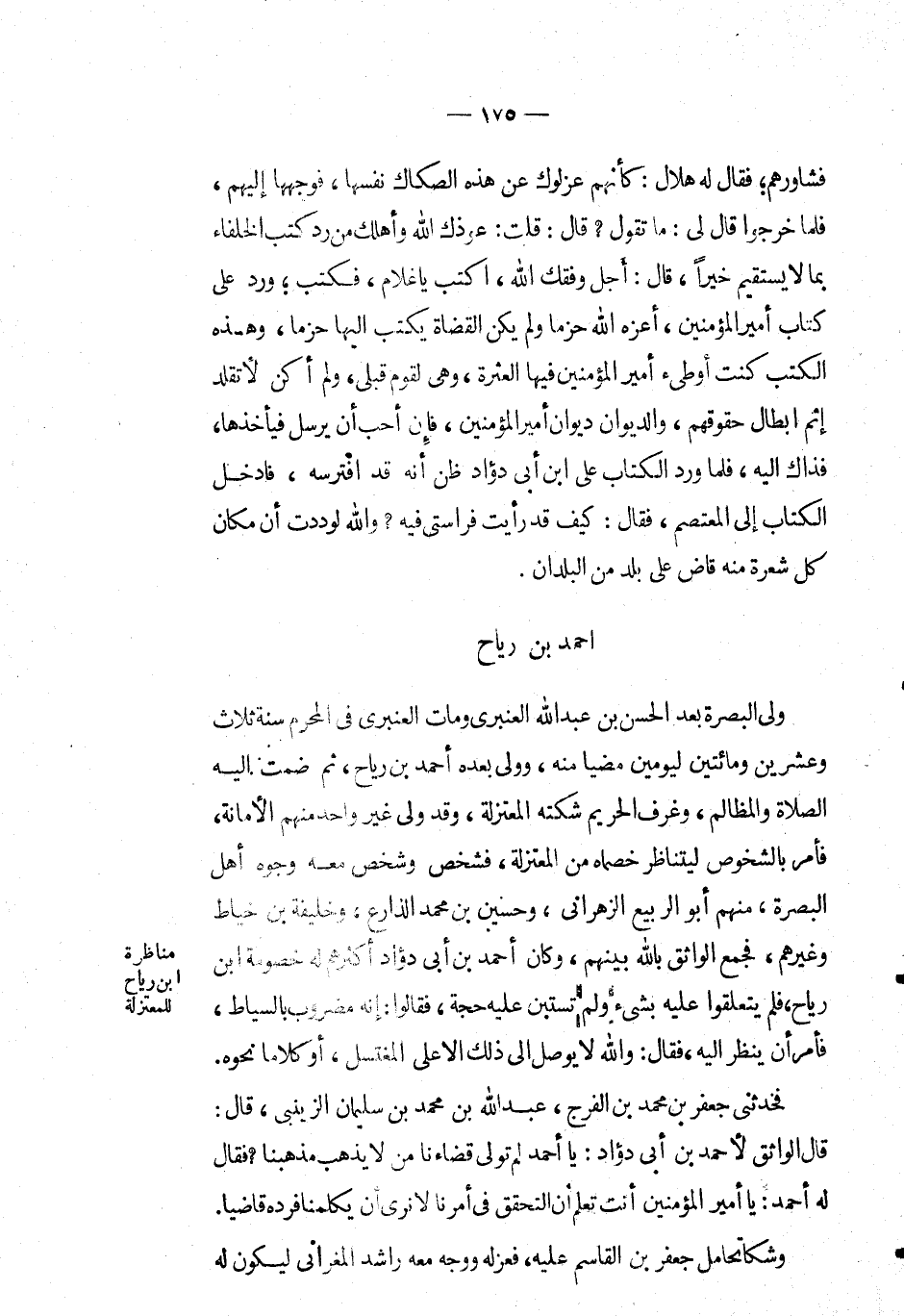 ولي البصرة بعد الْحَسَن بْن عَبْد اللهِ العنبري ومات العنبري في المحرم سنة ثلاث وعشرين ومائتين ليومين مضيا منه، وولي بعده أَحْمَد بْن رياح، ثم ضمت إليه الصلاة والمظالم، وغرف الحريم شكته المعتزلة، وقد ولي غير واحد منهم الأمانة، فأمر بالشخوص ليتناظر خصماه من المعتزلة، فشخص وشخص معه وخليفة بْن خياط وغيرهم، فجمع الواثق بالله بينهم، وكان أَحْمَد بْن أبي دؤاد أكثرهم له خصومة ابن رياح، فلم يتعلقوا عليه بشيء ولم تستبن عليه حجة، فقالوا: إنه مضروب بالسياط، فأمر أن ينظر إليه، فقال: والله لا يوصل إِلَى ذلك الاعلى المغتسل، أو كلاماً نحوه.