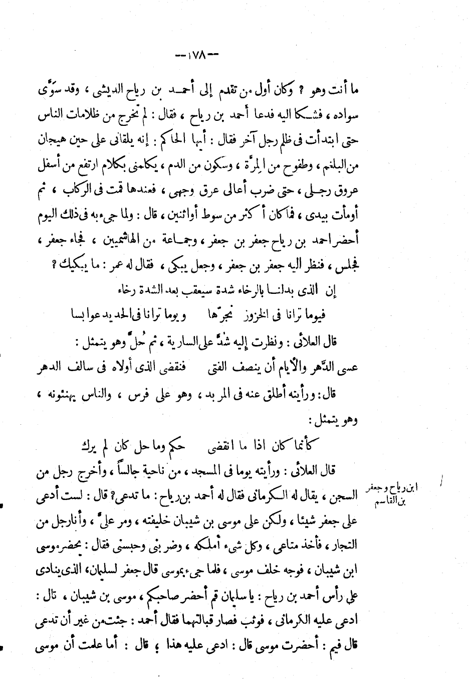 ما أنت وهو ? وكان أول من تقدم إِلَى أَحْمَد بْن رياح الديشي، وقد سوى سواده، فشكا إليه فدعا أَحْمَد بْن رياح، فقال: لم تخرج من ظلامات الناس حتى ابتدأت في ظلم رجل آخر فقال: أيها الحاكم: إنه يلقاني على حين هيجان من البلغم، وطفوح من المرة، وسكون من الدم، يكلمني بكلام ارتفع من أسفل عروق رجلي، حتى ضرب أعالي عرق وجهي، فعندها قمت في الركاب، ثم أومأت بيدي، فما كان أكثر من سوط أو اثنين، قال: ولما جىء به في ذلك اليوم أحضر أَحْمَد بْن رياح جعفر بْن جعفر، وجماعة من الهاشميين، فجاء جعفر، فجلس، فنظر إليه جعفر بْن جعفر، وجعل يبكي، فَقَالَ لَهُ عُمَر: ما يبكيك ? إن الذي بدلنا بالرخاء شدة سيعقب بعد الشدة رخاء