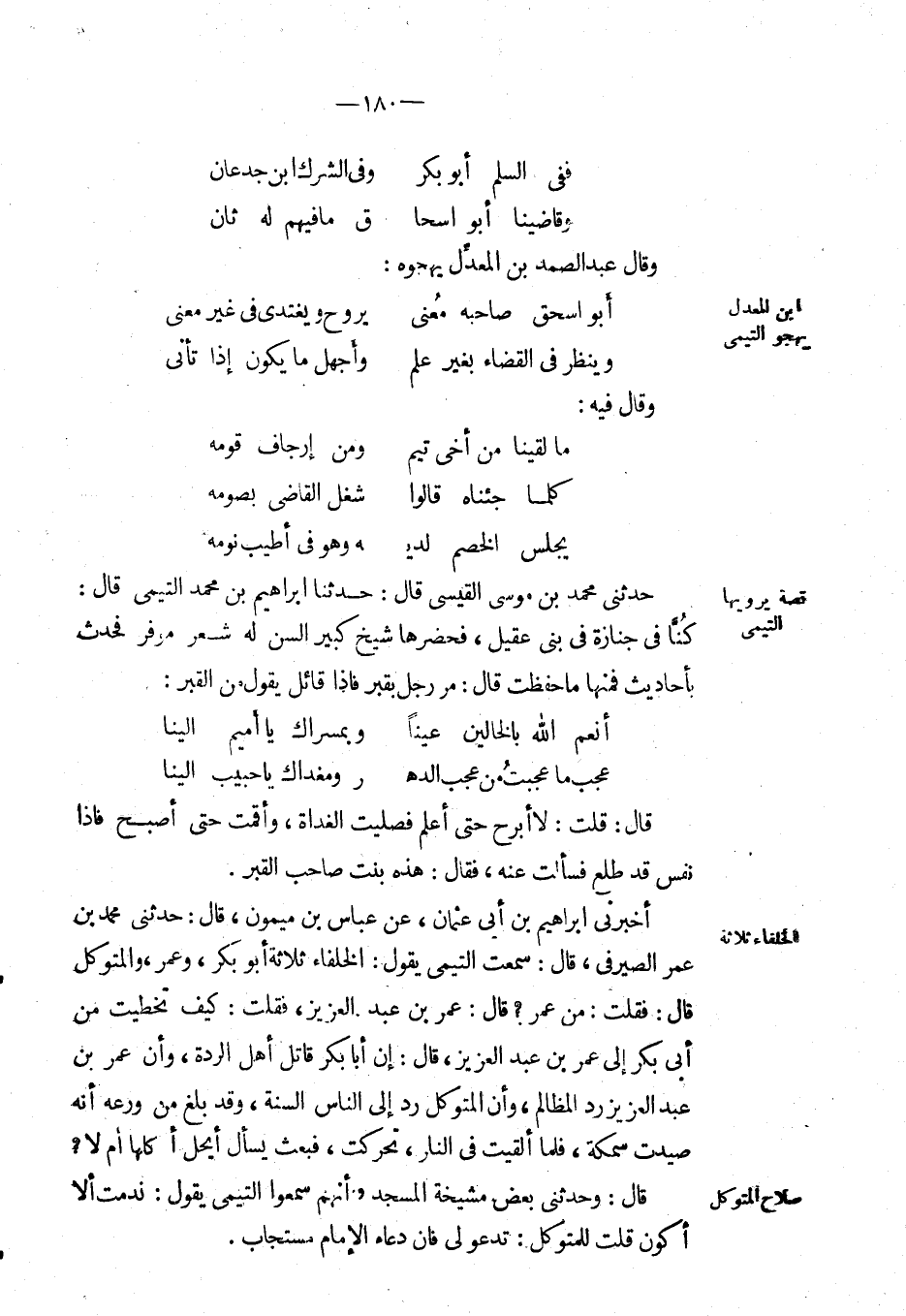 قال: وحَدَّثَنِي بعض مشيخة المسجد وأنهم سمعوا التيمي يقول: ندمت ألا أكون قلت للمتوكل: تدعو لي فإن دعاء الإمام مستجاب.