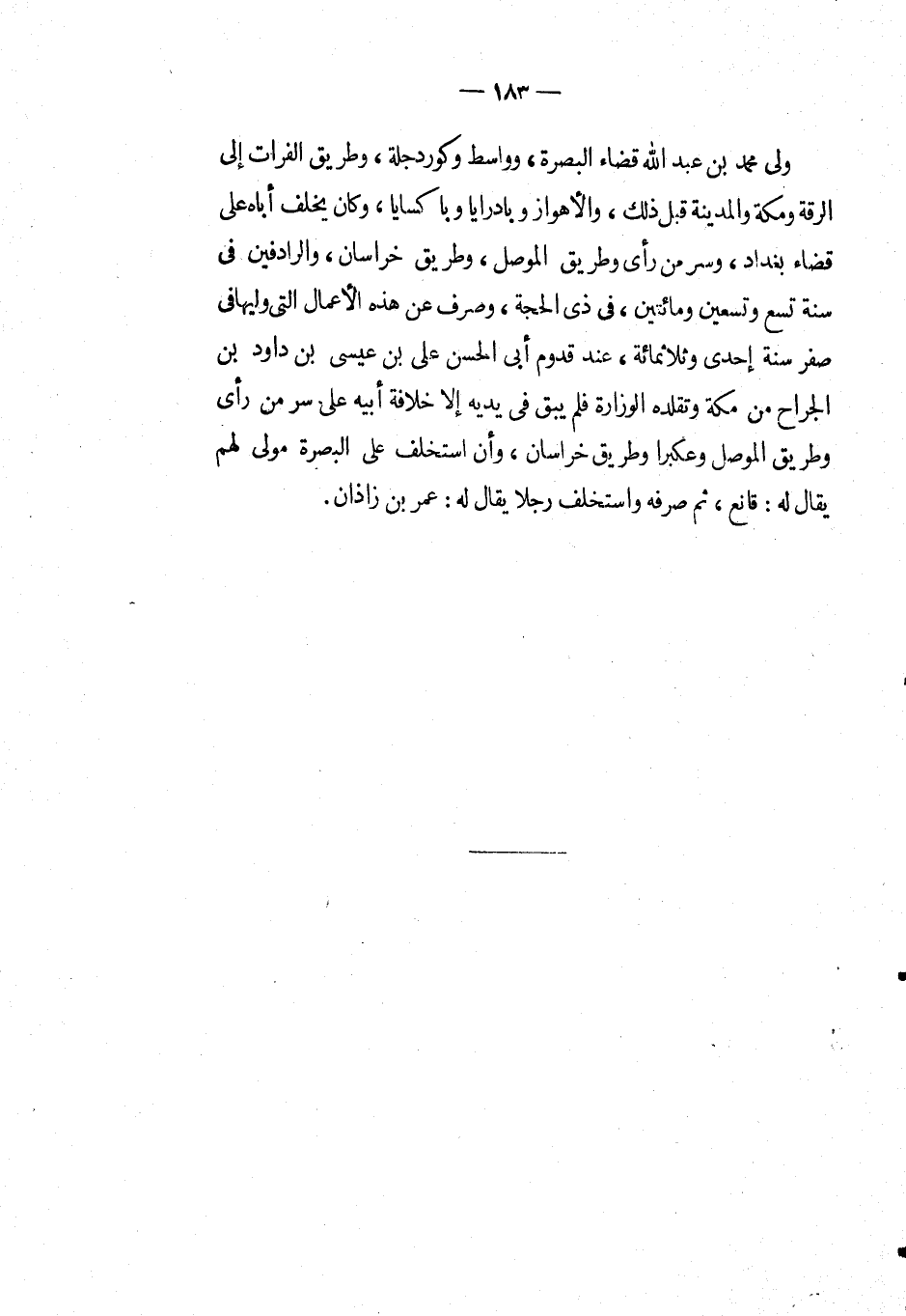 ولي مُحَمَّد بْن عَبْد اللهِ قضاء البصرة، وواسط وكور دجلة، وطريق الفرات إِلَى الرقة ومكة والمدينة قبل ذلك، والأهواز وبادرايا وباكسايا، وكان يخلف أباه على قضاء بغداد، وسر من رأى وطريق الموصل، وطريق خراسان، والرادفين في سنة تسع وتسعين ومائتين، في ذي الحجة، وصرف عَن هذه الأعمال التي وليها في صفر سنة إحدى وثلاثمائة، عند قدوم أبي الْحَسَن علي بْن عيسى بْن داود بْن الجراح من مكة وتقلده الوزارة فلم يبق في يديه إِلَّا خلافة أبيه على سر من رأى وطريق الموصل وعكبرا وطريق خراسان، وأن استخلف على البصرة مولى لهم يُقَالُ لَهُ: قانع، ثم صرفه واستخلف رجلاً يُقَالُ لَهُ: عُمَر بْن زاذان.