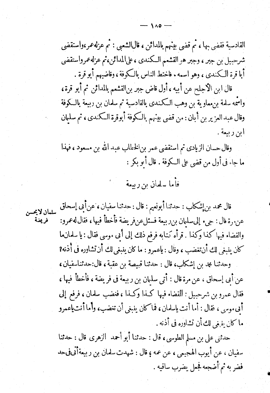 قَالَ: مُحَمَّد بْن إشكاب: حَدَّثَنَا أَبُو نعيم: قال: حَدَّثَنَا سُفْيَان، عَن أبي إسحاق عَن مرة قال: جىء إِلَى سليمان بْن ربيعة فسئل عَن فريضة فأخطأ فيها، فَقَالَ لَهُ عَمْرو: والقضاء فيها كذا وكذا. قرأه كتابه فرفع ذلك إِلَى أبي موسى فقال: يا سلمان ما كان ينبغي لك أن تغضب، وقال: يا عَمْرو: ما كان ينبغي لك أن تشاوره في أذنه ?