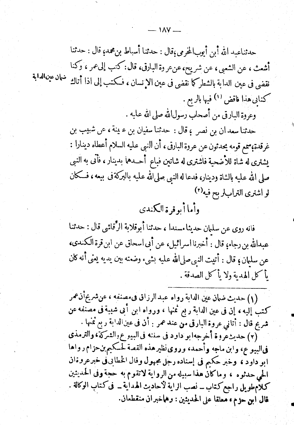 حَدَّثَنَا عَبْدُ اللهِ ابن أيوب المخرمي؛ قال: حَدَّثَنَا أسباط بْن مُحَمَّد؛ قال: حَدَّثَنَا أشعث، عَن الشعبي، عَن شريح، عَن عروة البارقي، قال: كتب إِلَى عُمَر، وكنا نقضي في عين الدابة بالشطر كما نقضي في عين الإنسان، فكتب إلي إِذَا أتاك كتابي هَذَا فاقض فيها بالربع. وعروة البارقي من أصحاب رسول الله صلى الله عليه.