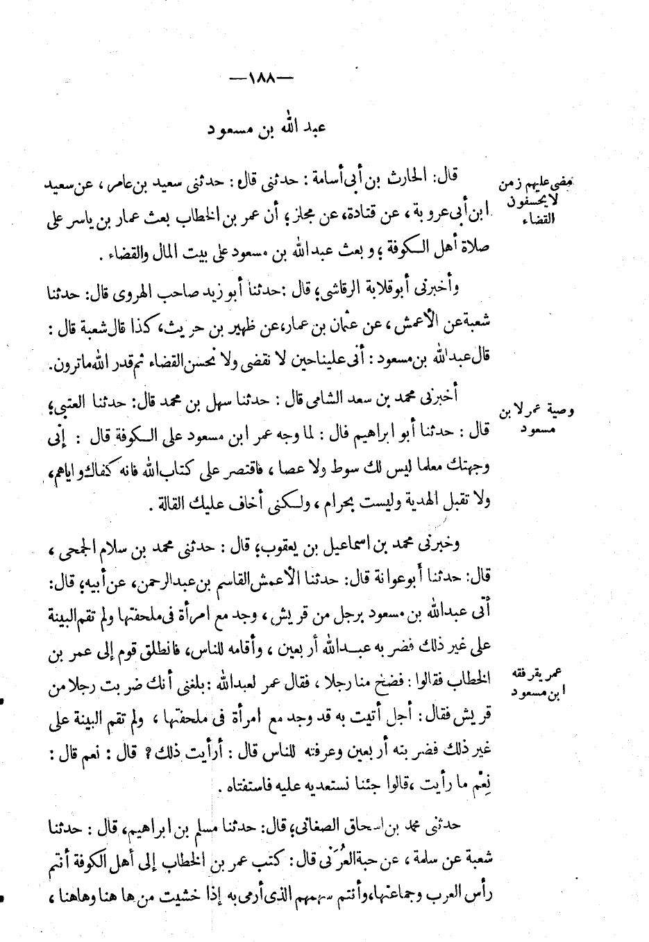 أَخْبَرَنِي مُحَمَّد بْن سعد الشامي قال: حَدَّثَنَا سهل بْن مُحَمَّد قال: حَدَّثَنَا العتبي؛ قال: حَدَّثَنَا أَبُو إبراهيم قال: لما وجه عُمَر ابن مسعود على الكوفة قال: إني وجهتك معلماً ليس لك سوط ولا عصا، فاقتصر على كتاب الله فإنه كفاك وإياهم، ولا تقبل الهدية وليست بحرام، ولكني أخاف عليك القالة.