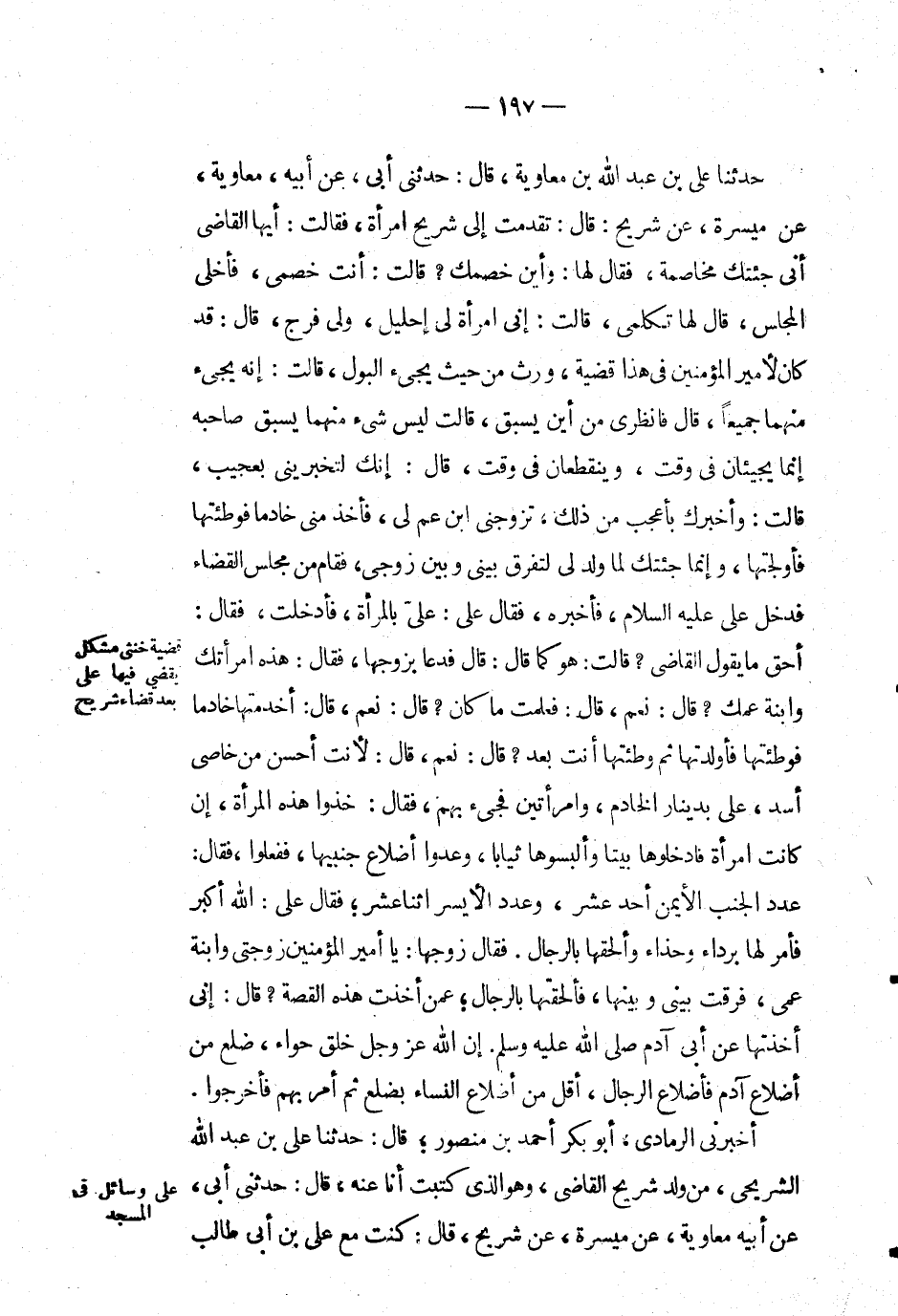 حَدَّثَنَا علي بْن عَبْد اللهِ بْن معاوية، قال: حَدَّثَنِي أبي، عَن أبيه، معاويه، عَن ميسرة، عَن شريح: قال: تقدمت إِلَى شريح امرأة، فقالت: أيها القاضي أني جئتك مخاصمة، فَقَالَ لَهَا: وأين خصمك ? قالت: أنت خصمي، فأخلى المجلس، قَالَ: لها تكلمي، قالت: إني امرأة لي إحليل، ولي فرج، قال: قد كان لأمير المؤمنين في هَذَا قضية، ورث من حَيْثُ يجيء البول، قالت: إنه يجيء منهما جميعاً، قَالَ: فانظري من أين يسبق، قالت ليس شيء منهما يسبق صاحبه إنما يجيئان في وقت، وينقطعان في وقت، قال: إنك لتخبريني بعجيب، قالت: وأخبرك بأعجب من ذلك، تزوجني ابن عم لي، فأخذ مني خادماً فوطئتها فأولجتها، وإنما جئتك لما ولد لي لتفرق بيني وبين زوجي، فقام من مجلس القضاء فدخل علي رضي الله عنه, فأخبره، فَقَالَ: علي: علي بالمرأة، فأدخلت، فقال: أحق ما يقول القاضي ? قالت: هو كما قال: قَالَ: فدعا بزوجها، فقال: هذه امرأتك وابنة عمك ? قال: نعم، قال: فعلمت ما كان ? قال: نعم، قال: أخدمتها خادماً فوطئتها فأولدتها ثم وطئتها أنت بعد ? قال: نعم، قال: لأنت أحسن من خاصي أسد، علي بدينار الخادم، وامرأتين فجىء بهم، فقال: خذوا هذه المرأة، إن كانت امرأة فادخلوها بيتاً وألبسوها ثياباً، وعدوا أضلاع جنبيها، ففعلوا، فقال: عدد الجنب الأيمن أحد عشر، وعدد الأيسر اثنا عشر؛ فَقَالَ: علي: الله أكبر فأمر لها برداء وحذاء وألحقها بالرجال. فَقَالَ: زوجها: يا أمير المؤمنين زوجتي وابنة عمي، فرقت بيني وبينها، فألحقتها بالرجال؛ عمن أخذت هذه القصة ? قال: إني أخذتها عَن أبي آدم صَلَّى اللَّهُ عَلَيْهِ وَسَلَّمَ. إن الله عز وجل خلق حواء، ضلع من أضلاع آدم فأضلاع الرجال، أقل من أضلاع النِّسَاء بضلع ثم أمر بهم فأخرجوا.
